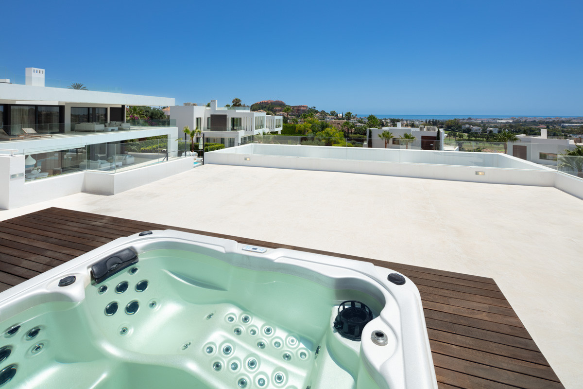 Villa contemporaine de luxe flambant neuve, idéalement située dans la célèbre Vallée du Golf, avec en toile de fond l'emblématique montagne de La Concha à Marbella. Récemment construite avec des matériaux de qualité, cette villa de 6 chambres s'adapte parfaitement au climat andalou et offre de nombreux espaces extérieurs ombragés et propices à la détente. Répartie sur trois niveaux, elle comprend : au rez-de-chaussée : un spacieux séjour avec plusieurs coins salon ; une cuisine ouverte entièrement équipée avec un îlot central et une cave à vin ; une chambre d'amis avec salle de bains privative ; l'accès aux porches, terrasses, piscine et au jardin paysager soigné, agrémenté de plantes matures, qui entoure la propriété, assure une intimité totale avec les habitations voisines. À l'étage : deux chambres d'amis avec salle de bains privative et une vue imprenable sur la Vallée du Golf ; une superbe suite parentale avec dressing et une terrasse panoramique offrant également une vue imprenable. Au sous-sol : une autre chambre d'amis avec salle de bains privative ; un garage pour deux voitures. Possibilité d'aménager une salle de sport à ce niveau. Un abri voiture pour deux voitures. Le chauffage au sol dans les salles de bains et un système domotique complètent la propriété. À quelques minutes de plusieurs écoles internationales, de terrains de golf de classe mondiale, d'expériences gastronomiques et de commodités, cette magnifique maison est située dans un complexe calme et fermé avec sécurité 24 heures sur 24, garantissant une intimité totale.