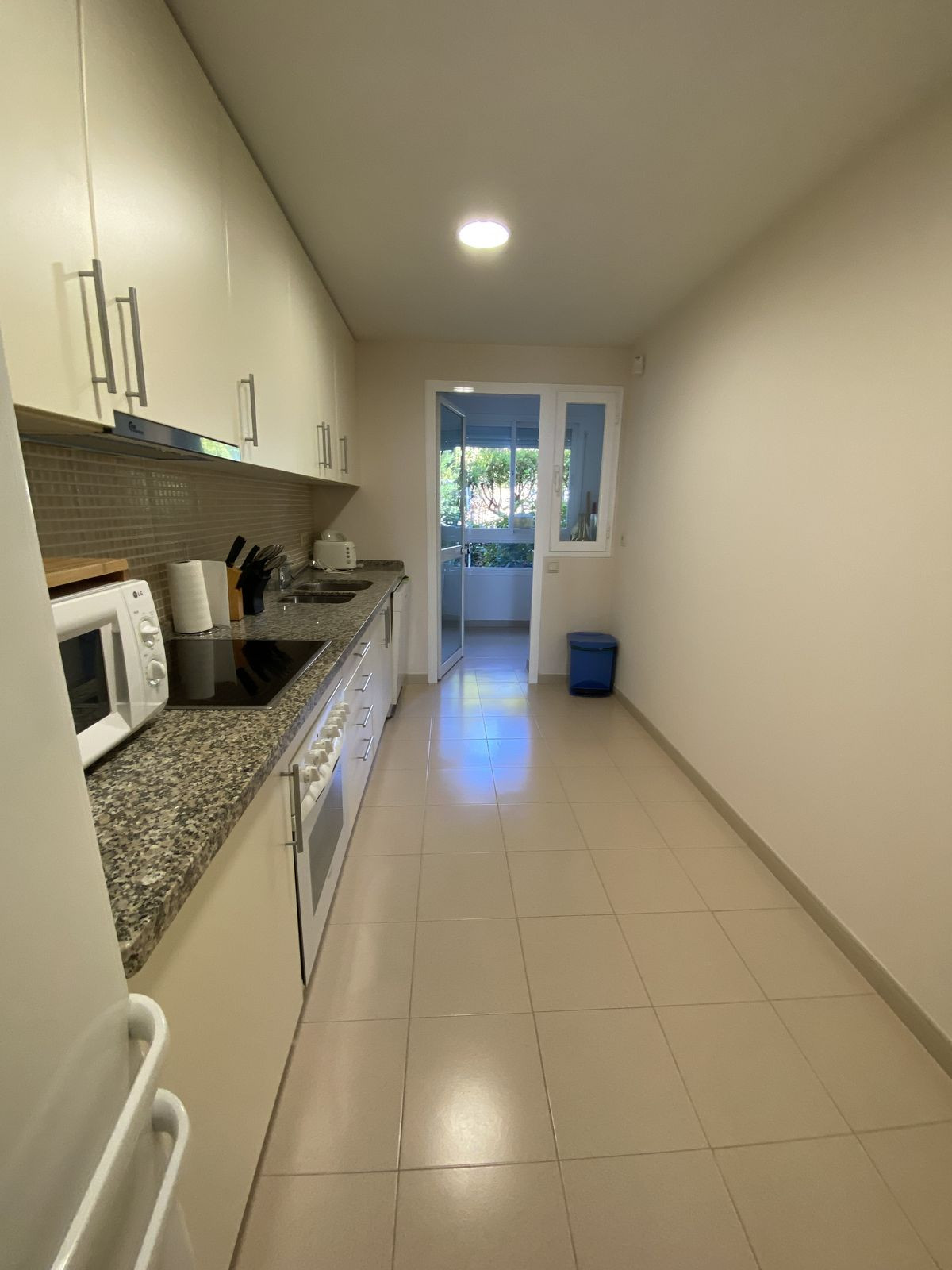 En entrant dans l'appartement, nous trouvons un grand salon/salle à manger avec accès direct à la belle terrasse et au jardin. Cet espace est idéal pour se détendre au calme, sans vis-à-vis et avec une grande intimité. Le salon donne sur la cuisine entièrement équipée et une buanderie séparée avec lave-linge et sèche-linge.