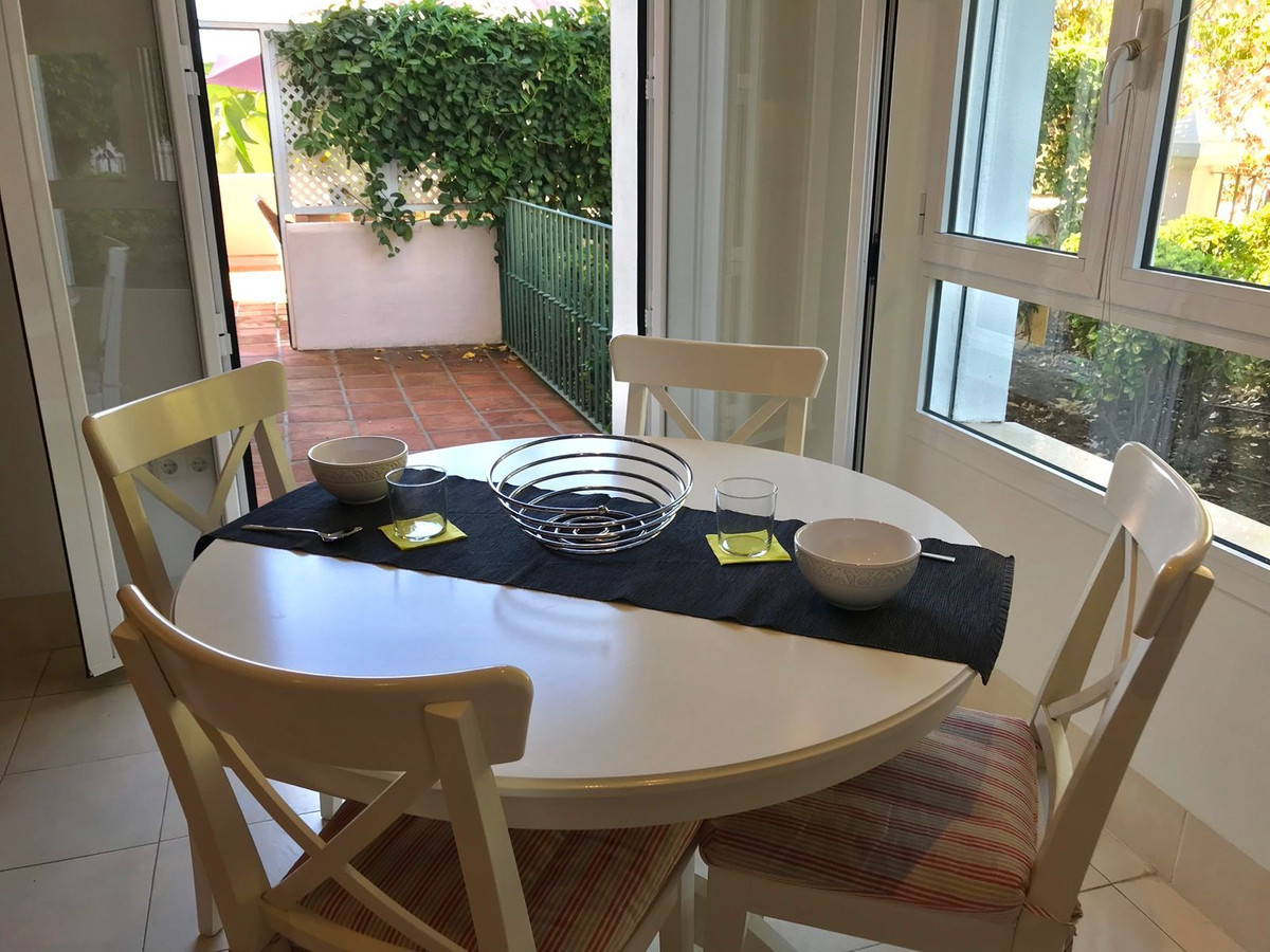 L'appartement dispose d'une cuisine entièrement équipée avec table de petit-déjeuner, donnant directement sur une charmante terrasse latérale, idéale pour un café matinal ou un repas décontracté. Une buanderie séparée est intégrée à la cuisine.