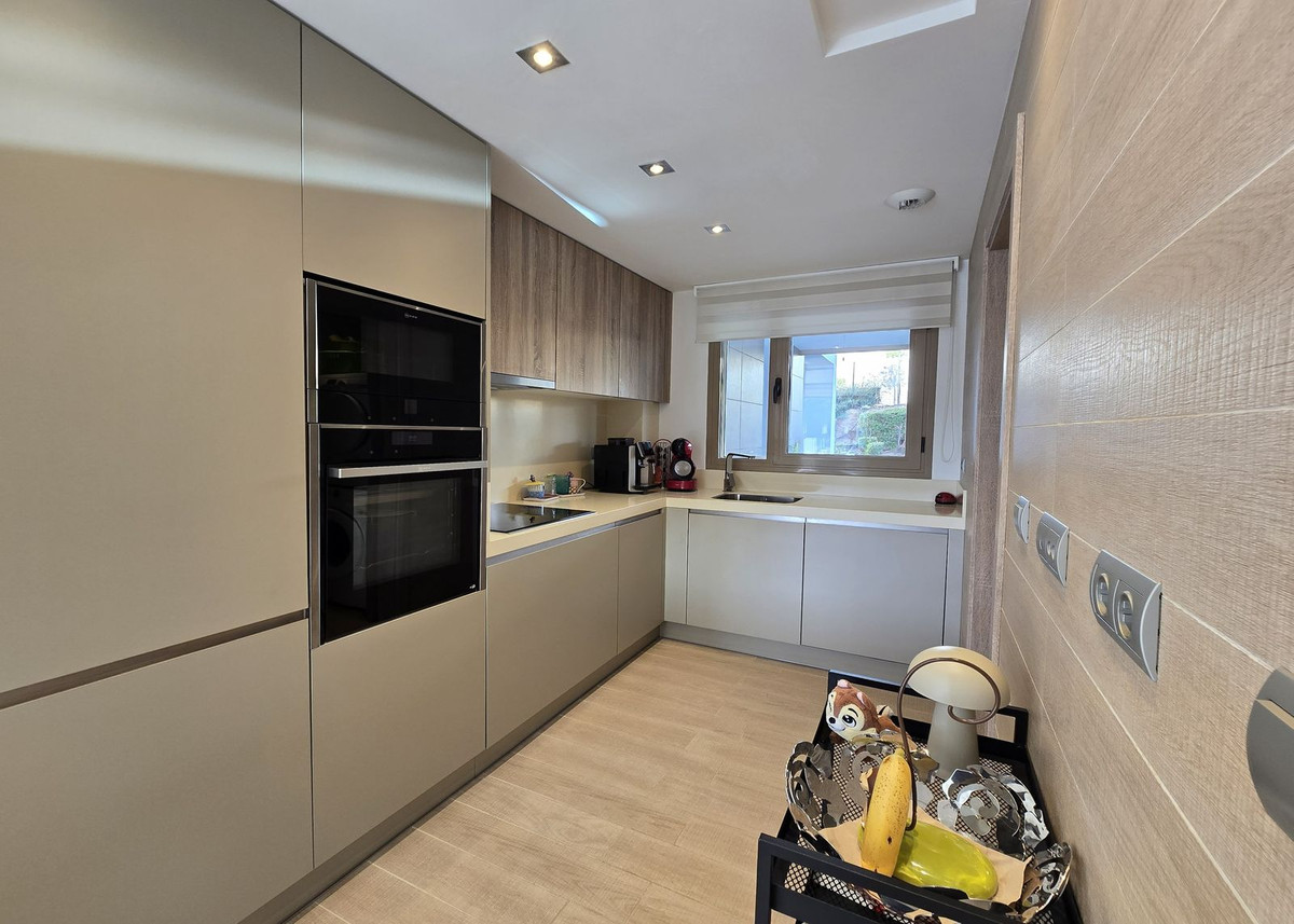 L'appartement dispose d'un spacieux et lumineux séjour-salle à manger ouvrant sur la terrasse, créant une parfaite harmonie entre l'intérieur et l'extérieur pour se détendre et profiter d'une vue imprenable sur le golf. La cuisine entièrement équipée, avec son élégant plan de travail en résine et sa buanderie attenante, allie style et fonctionnalité. Les chambres spacieuses sont dotées de grands placards et de fenêtres oscillo-battantes en aluminium à double vitrage et de volets roulants électriques. La climatisation (chaud et froid) et le chauffe-eau solaire thermique à économie d'énergie assurent un confort moderne.