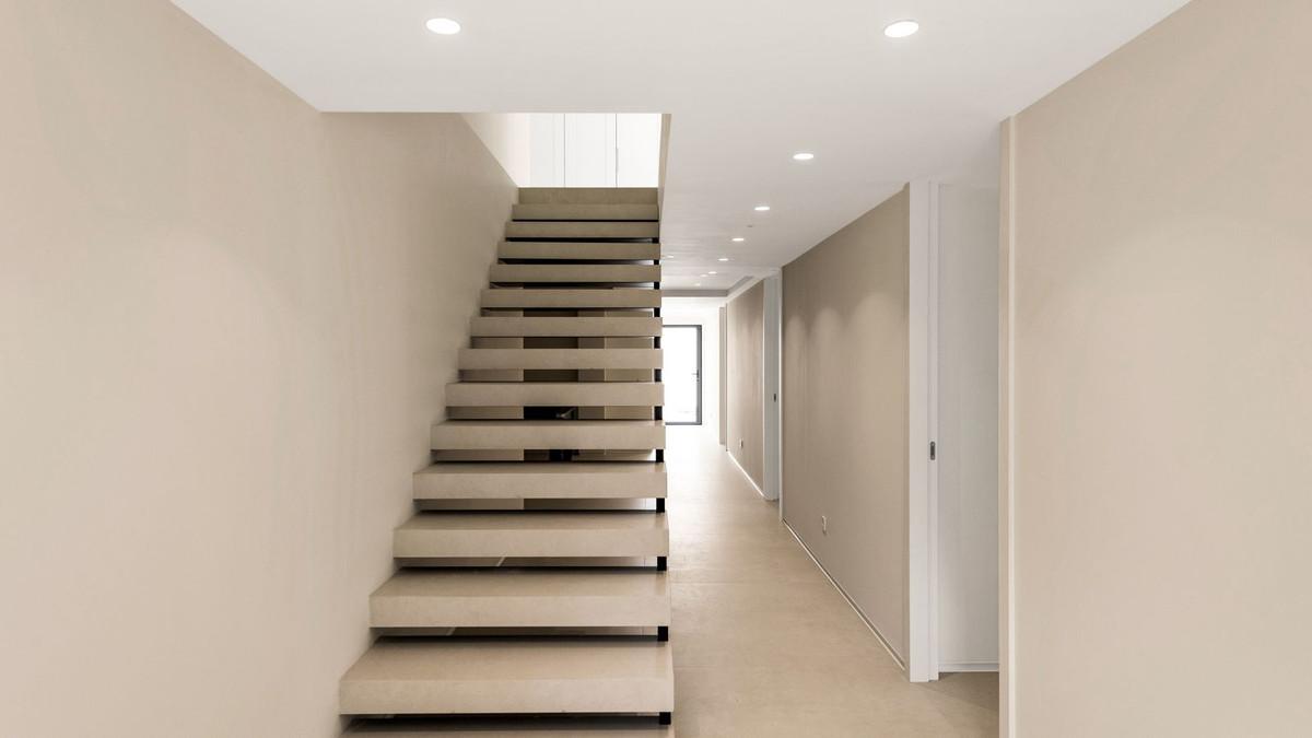 Située sur un terrain de 900 m², la propriété offre 419 m² d'espace construit, avec des intérieurs ouverts inondés de lumière naturelle grâce à des fenêtres minimalistes du sol au plafond.