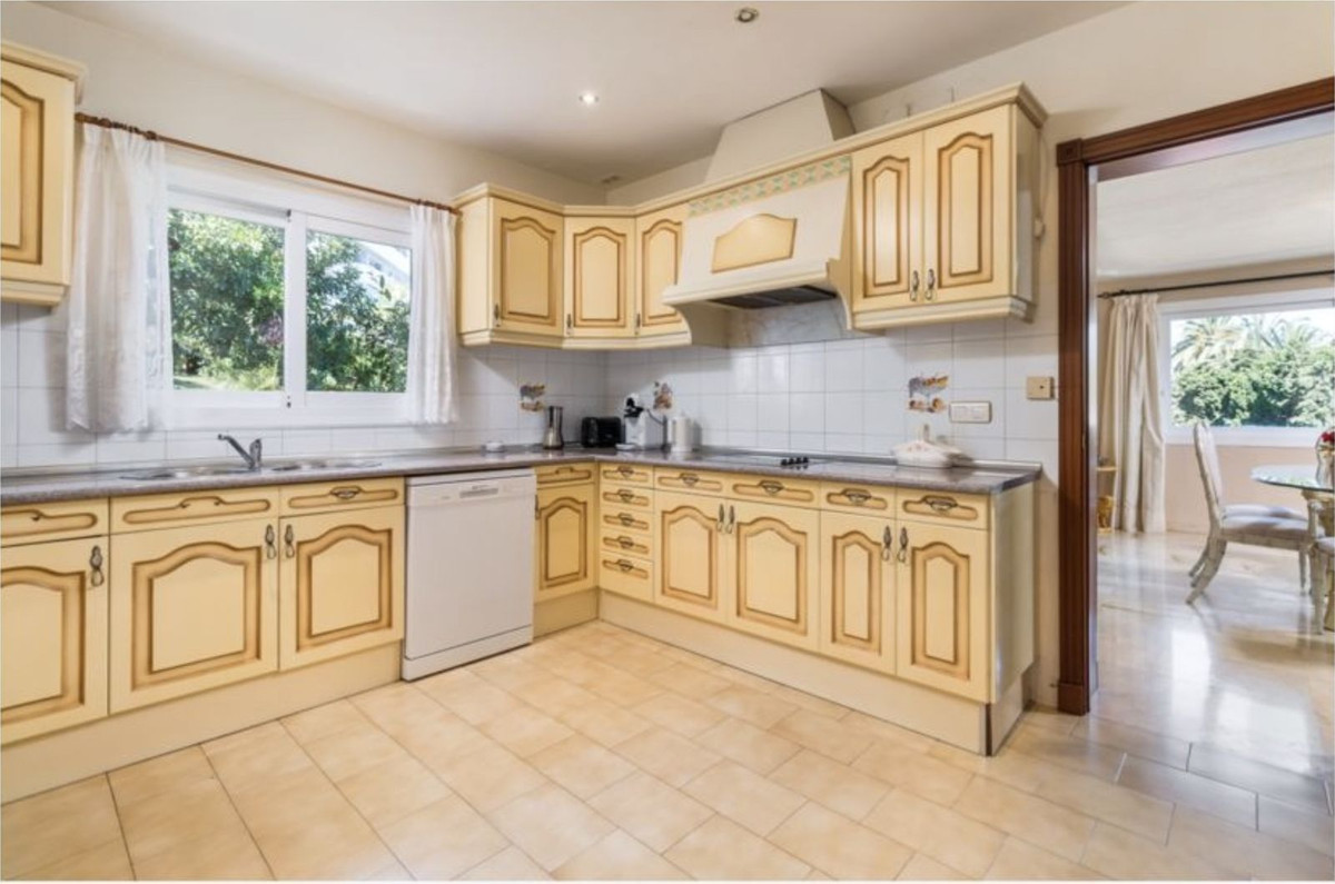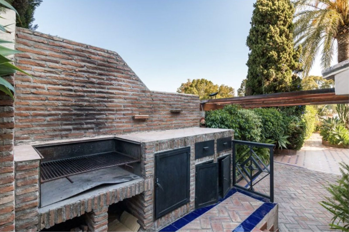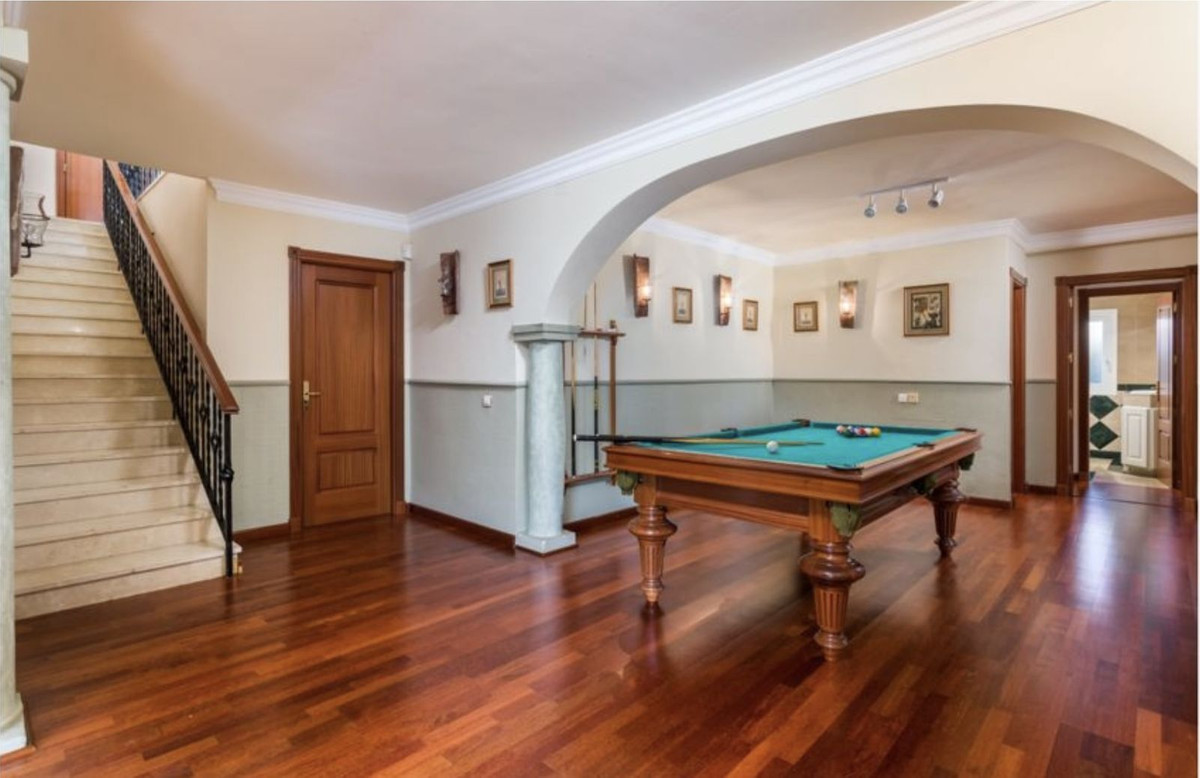 La suite parentale, située à l'étage, s'ouvre sur une terrasse. Le salon, avec ses doubles vues, est agrémenté d'une cheminée fonctionnelle et de portes coulissantes donnant sur une grande terrasse couverte. Depuis le salon, une arche mène à la salle à manger pouvant accueillir confortablement 8 personnes, puis à une spacieuse cuisine entièrement équipée, également accessible depuis le hall. Le rez-de-chaussée comprend deux suites parentales, une cuisine supplémentaire avec espace barbecue et une seconde salle de réception, actuellement utilisée comme salle de billard. Les portes s'ouvrent également sur une terrasse couverte ensoleillée.