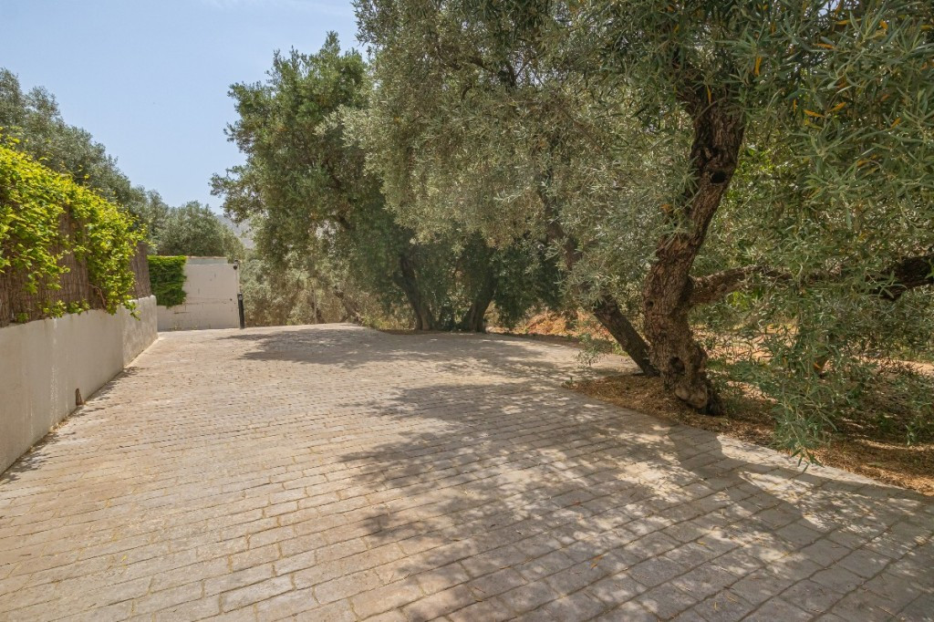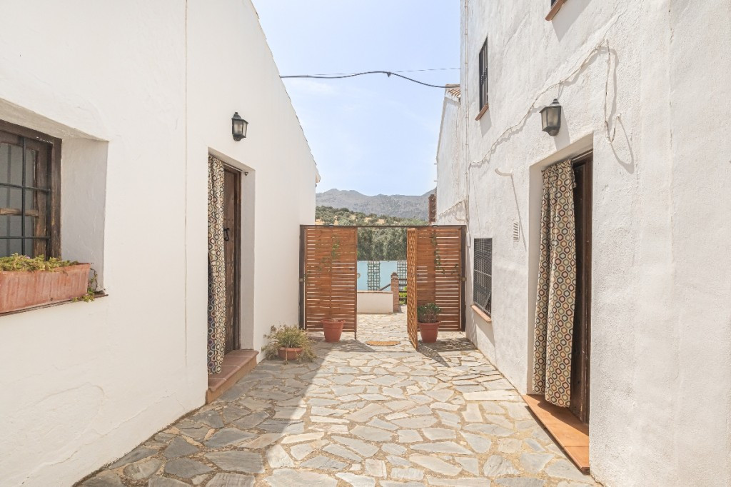 Vehicle entrance with parking for several vehicles and a fully fenced green area with olive trees. A picturesque entrance through a reception hallway leads to a beautiful interior courtyard that divides the 3 properties and also provides access to the pool and barbecue area.