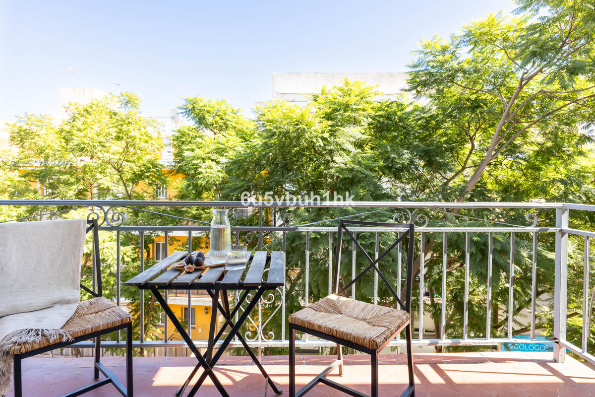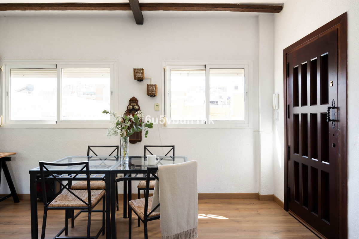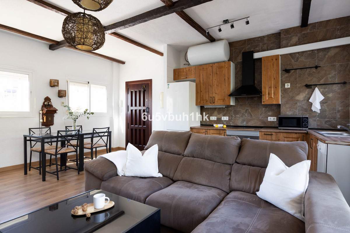 This charming apartment is situated on the third floor and offers a beautiful Andalusian touch with exposed wooden beams and high ceilings. The open-plan kitchen and living area create a bright and airy atmosphere with direct access to the sunny south-facing terrace — perfect for outdoor furniture, dining, and relaxation. The property features two spacious bedrooms with built-in wardrobes, one of which has a French balcony. A stylish bathroom completes the home.This property also includes an impressive rooftop terrace with stunning views over Fuengirola and the surrounding mountainsHere you live close to restaurants, shops, the train station, and the beach — everything you need to enjoy the best of life on the Costa del Sol!For more information or to arrange a viewing, please contact us.