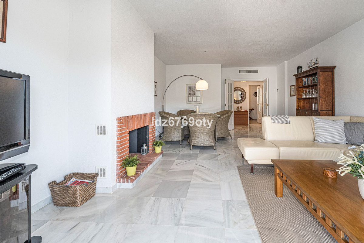 The 3-bedroom apartment, which is in excellent condition has a living area of 120m2, faces south-west and is located on the 1st floor. Through the main entrance there is a wheelchair lift to the normal lift which takes you to both the different floors and the indoor garage. The flat is therefore easily accessible for wheelchairs. The neutrally decorated flat is fully furnished, equipped with air conditioning/heating and has fast Wi-Fi. The open and spacious kitchen offers various built-in appliances, including a dishwasher, oven, microwave, fridge/freezer and a ceramic hob. From the kitchen you have access to a private patio of 35m2 wich can be used in many ways. From the dining/living room with a cosy fireplace there is direct access to the spacious terrace of 40m2 with sea views and space for both various sun loungers and a dining area for 6 people. The spacious master bedroom has fitted wardrobes and direct access to the terrace. The en-suite bathroom has double sinks, a bath/shower and a toilet. The second bedroom has fitted wardrobes and also access to the terrace and, together with the third bedroom, shares a separate second bathroom with a bath/shower and a toilet. The flat also has a laundry area with a washing machine and a dryer. In the underground car park, there is a personal storage room and 2 private parking spaces.