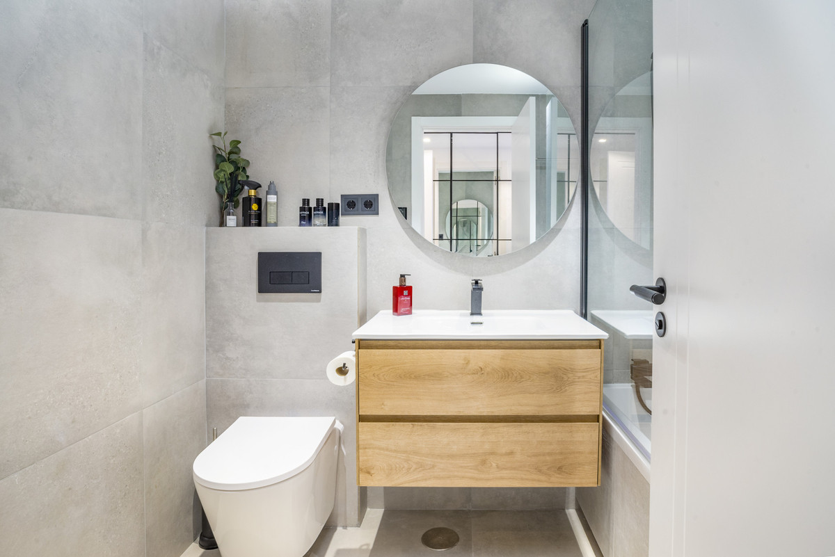 The interior follows a contemporary Scandinavian style, defined by clean lines, bright spaces, and high-quality finishes. The open-plan kitchen, equipped with Siemens appliances, integrates perfectly with the dining and living areas, creating a fluid layout suited for both relaxed living and entertaining. Large sliding doors lead to the west-facing terrace, where residents can enjoy panoramic views over the Los Arqueros golf course and surrounding mountain landscape. From here, sunsets are particularly striking, making evenings on the terrace a highlight of the property.