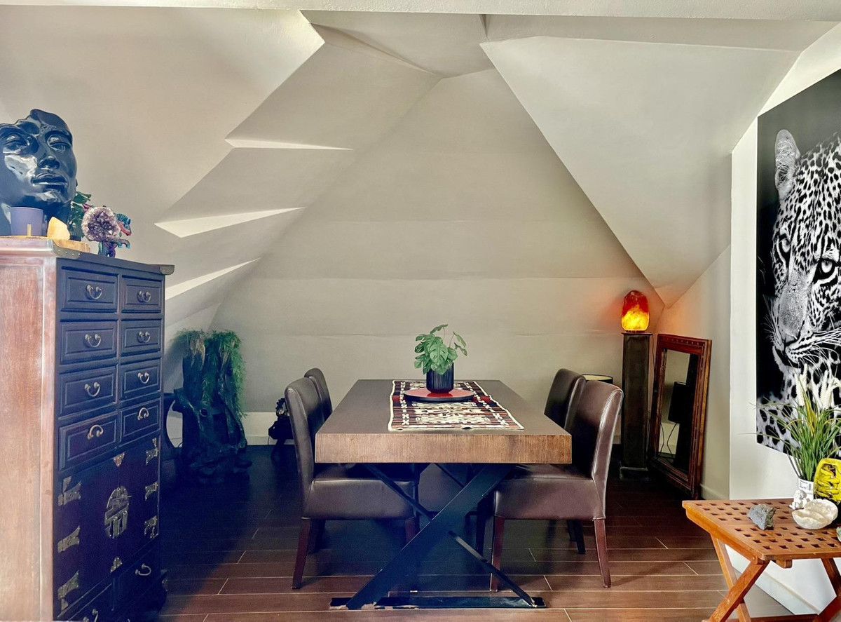 The apartment is accessed via a private entrance hall, with stairs leading to a bright and spacious main floor. The open-plan living and dining area is designed in a modern loft style, featuring high ceilings and large windows that flood the space with natural light. A fully equipped kitchen complements the living area, creating a seamless flow for everyday living and entertaining.