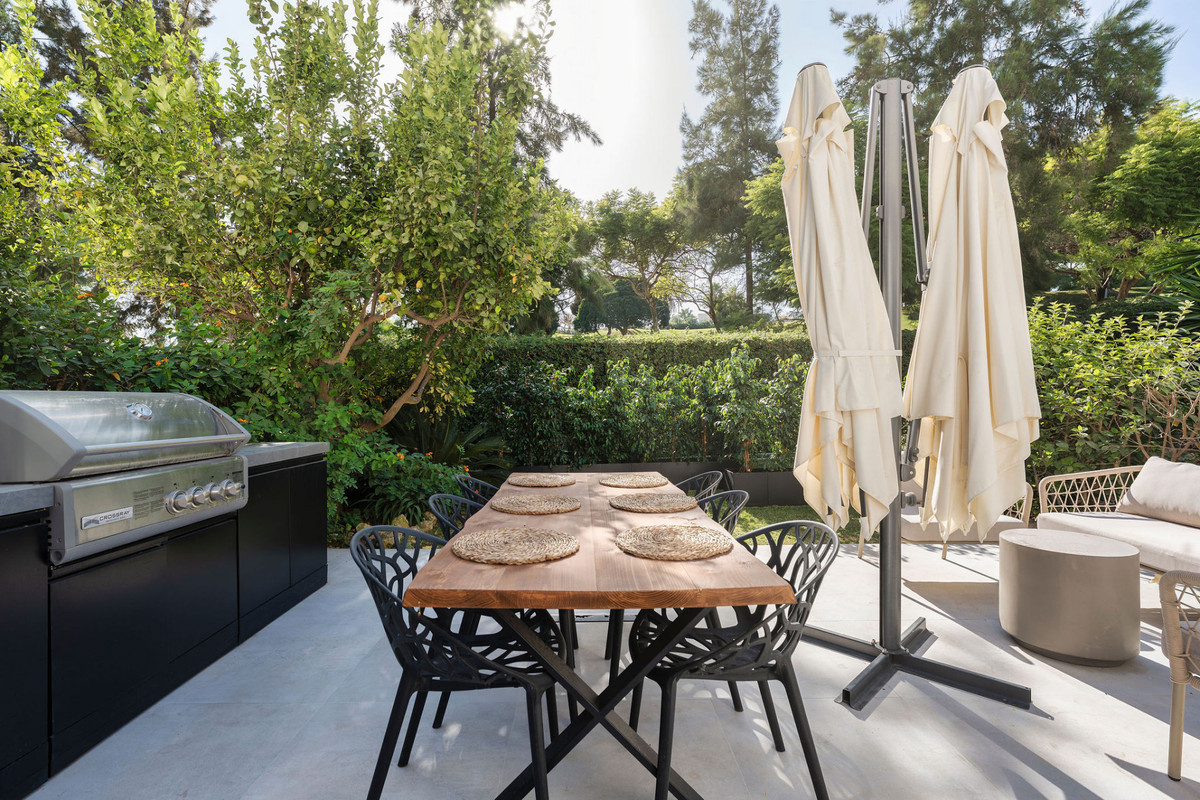 The terrace extends the living space outdoors, creating a natural transition ideal for relaxation and entertaining. With dedicated areas for lounging and dining, including a built-in barbecue, this space invites al fresco meals with stunning sunset views and the peaceful backdrop of the golf course’s greenery. The kitchen, fitted with Siemens appliances, is sleek and minimalist, designed to maximize efficiency without compromising on aesthetics.