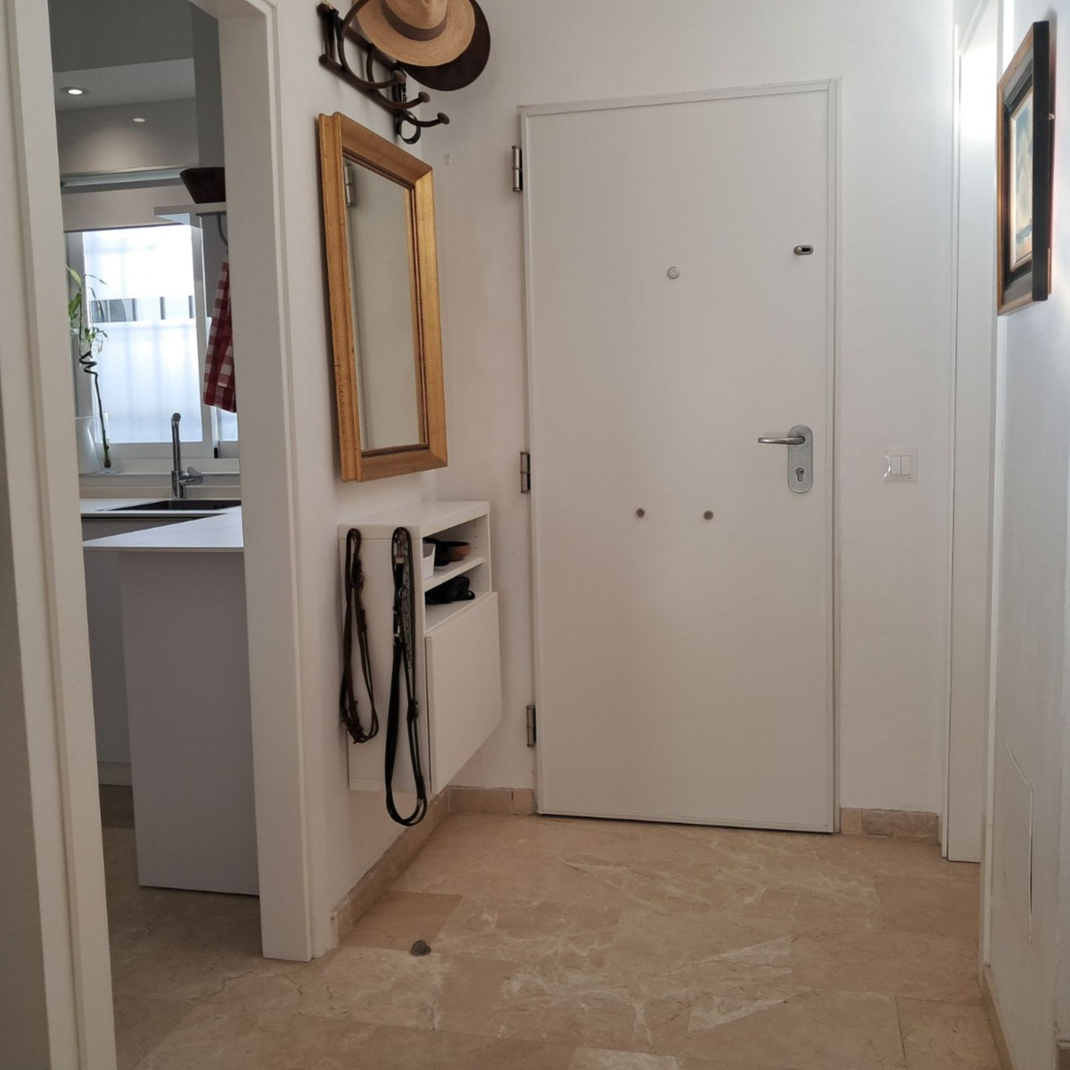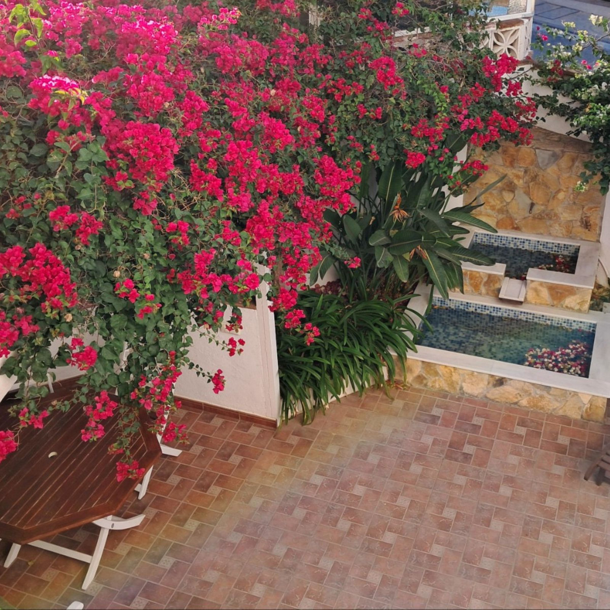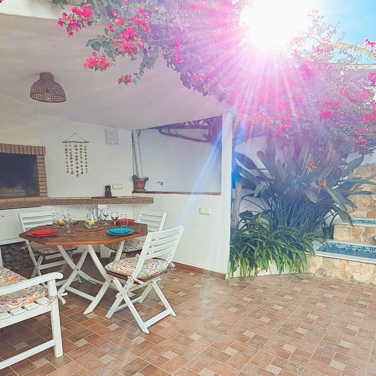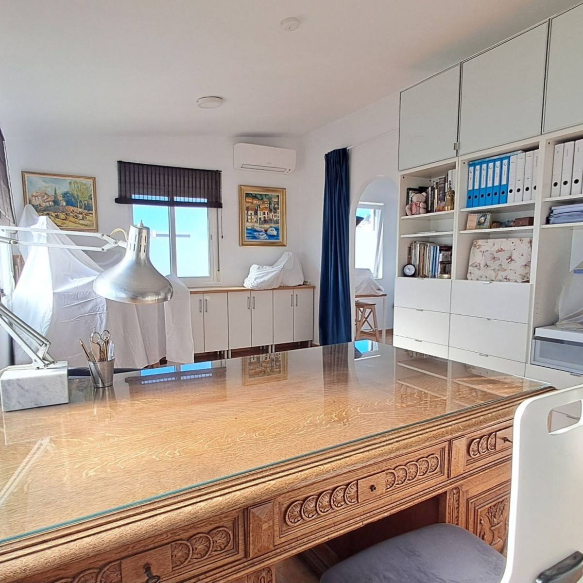 Au premier étage se trouvent trois chambres et deux salles de bains. La chambre principale dispose d'une salle de bains privative, tandis que la salle de bains familiale a été entièrement rénovée avec des matériaux haut de gamme. Le deuxième étage abrite une quatrième chambre spacieuse, actuellement aménagée en bureau, qui donne directement sur une terrasse de 18 m² sur le toit, entièrement rénovée en 2022, offrant une vue partielle sur la mer et même un aperçu de Gibraltar.