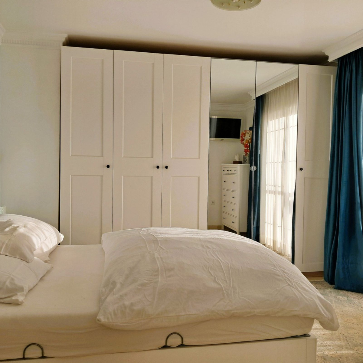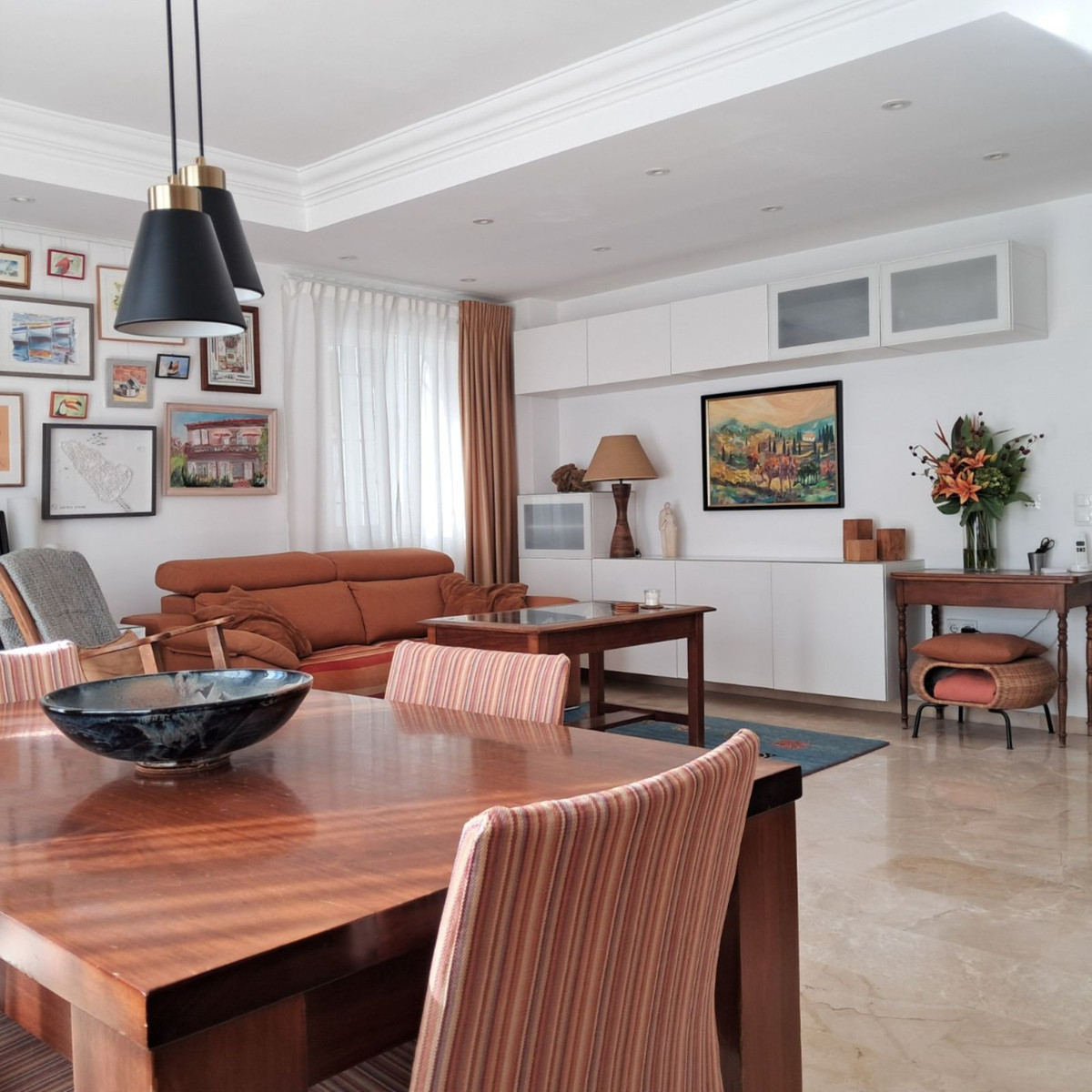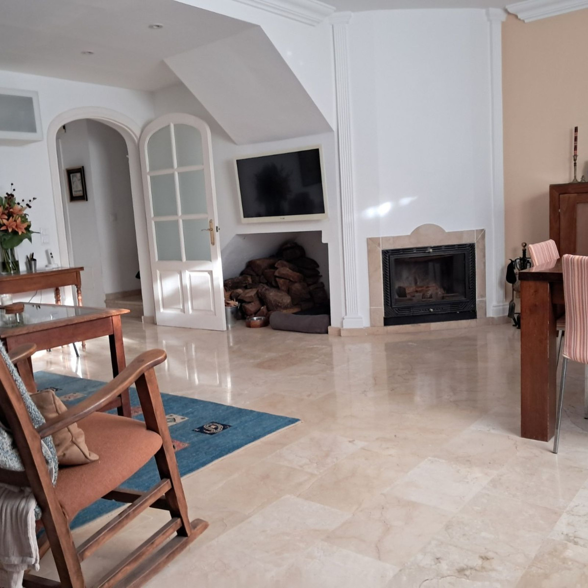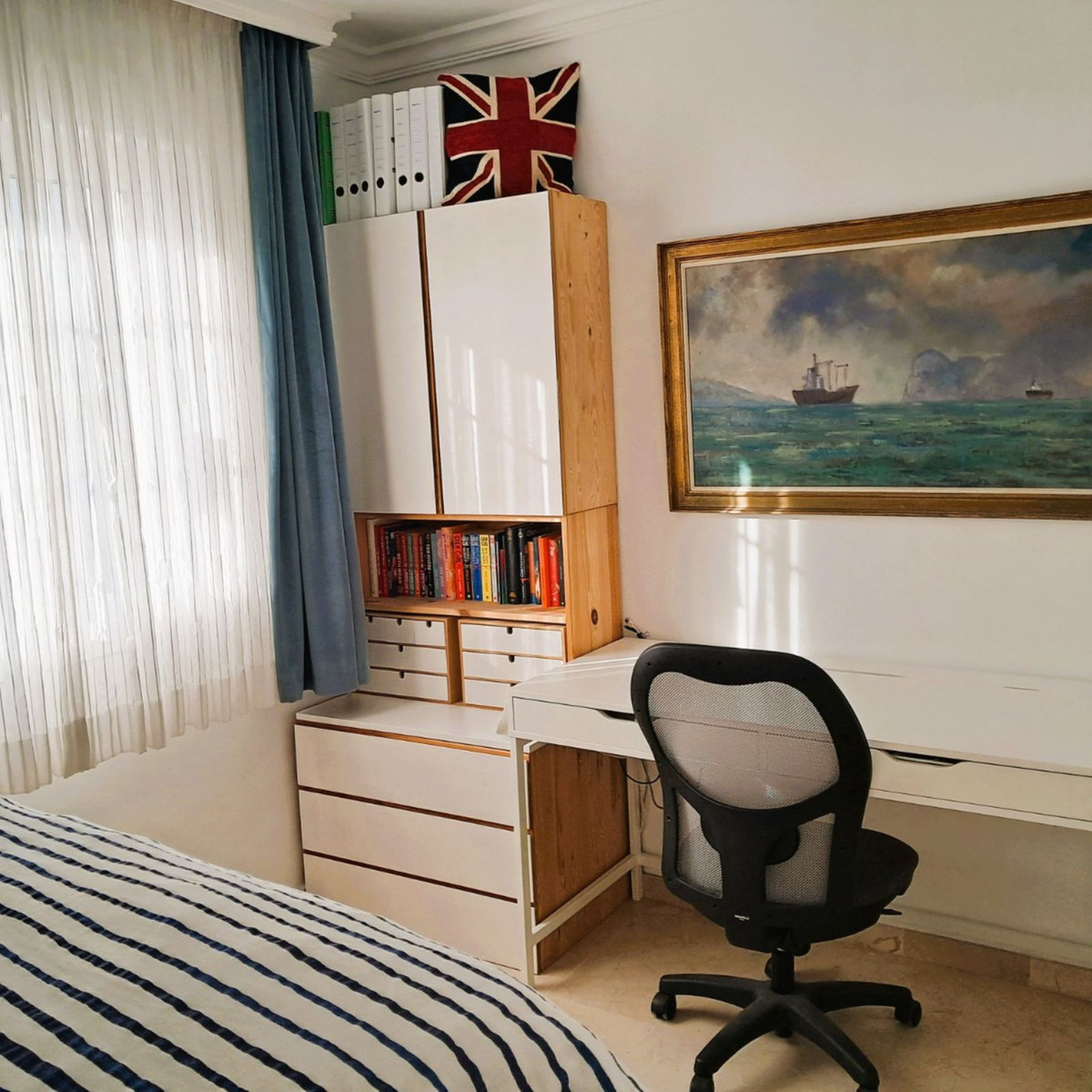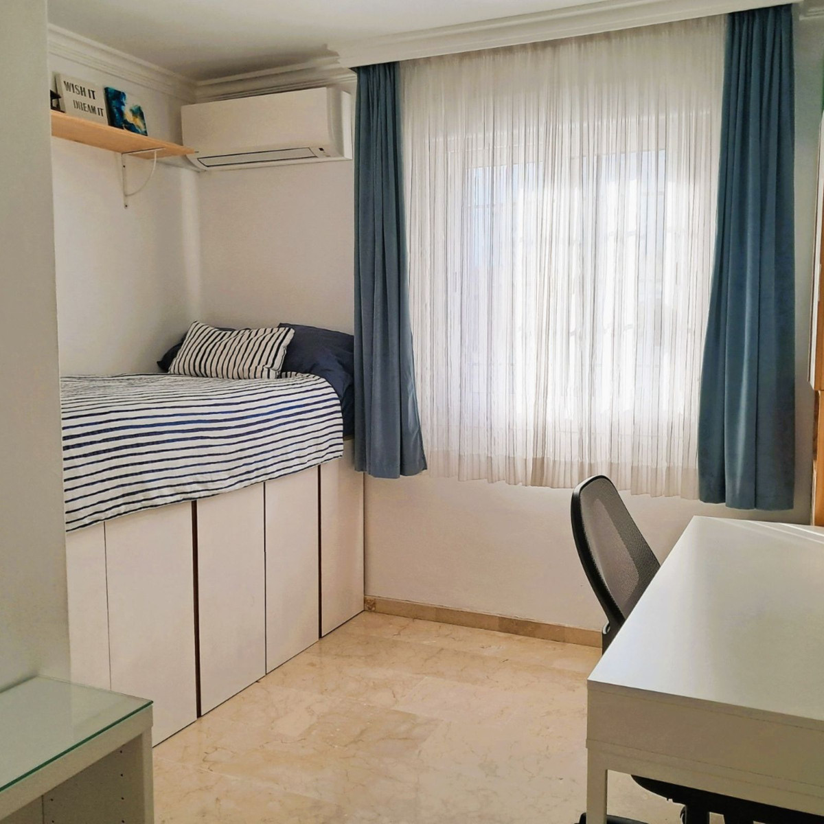 Au premier étage se trouvent trois chambres et deux salles de bains. La chambre principale dispose d'une salle de bains privative, tandis que la salle de bains familiale a été entièrement rénovée avec des matériaux haut de gamme. Le deuxième étage abrite une quatrième chambre spacieuse, actuellement aménagée en bureau, qui donne directement sur une terrasse de 18 m² sur le toit, entièrement rénovée en 2022, offrant une vue partielle sur la mer et même un aperçu de Gibraltar.
