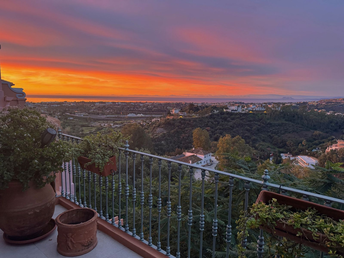 En approchant de l'entrée, quelques marches mènent à la porte principale. Une fois à l'intérieur, vous découvrirez un espace de vie et salle à manger spacieux et lumineux, baigné de lumière grâce à ses baies vitrées qui créent une atmosphère chaleureuse. Accédez ensuite à votre vaste terrasse couverte de 22 m², équipée de rideaux de verre, qui vous permettra d'admirer la vue panoramique imprenable sur Benahavís, les majestueuses montagnes environnantes, l'emblématique Rocher de Gibraltar et la mer scintillante. La magnifique vue dégagée au sud-ouest procure une sensation de bien-être tout au long de l'année ; par temps clair, vous pourrez même apercevoir la côte africaine et les montagnes de l'Atlas – un spectacle à couper le souffle ! Les couchers de soleil y sont tout simplement spectaculaires.