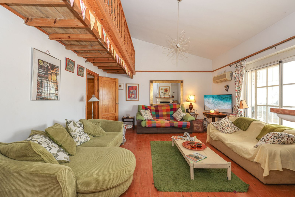 La maison est spacieuse et offre un fort potentiel, bien qu'elle nécessite des travaux de rénovation. De grandes portes-fenêtres s'ouvrent sur la pièce de vie centrale : une salle à manger lumineuse avec une cuisine ouverte. À droite, le salon dispose d'une mezzanine, idéale pour aménager un coin nuit supplémentaire ou un coin lecture. De ce côté de la maison se trouvent également deux chambres doubles, chacune avec sa propre salle de bains.