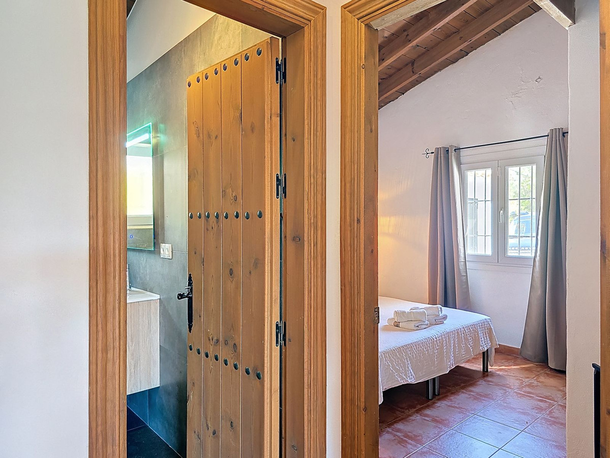 La propriété comprend trois chambres doubles spacieuses, chacune dotée de rangements intégrés et offrant une vue sur la campagne environnante. L'une des chambres bénéficie d'une salle de bains privative, pour plus d'intimité et de confort. Une seconde salle de bains familiale, ornée de carreaux andalous traditionnels et d'équipements modernes, offre un espace lumineux et fonctionnel, aussi bien pour les résidents que pour leurs invités.