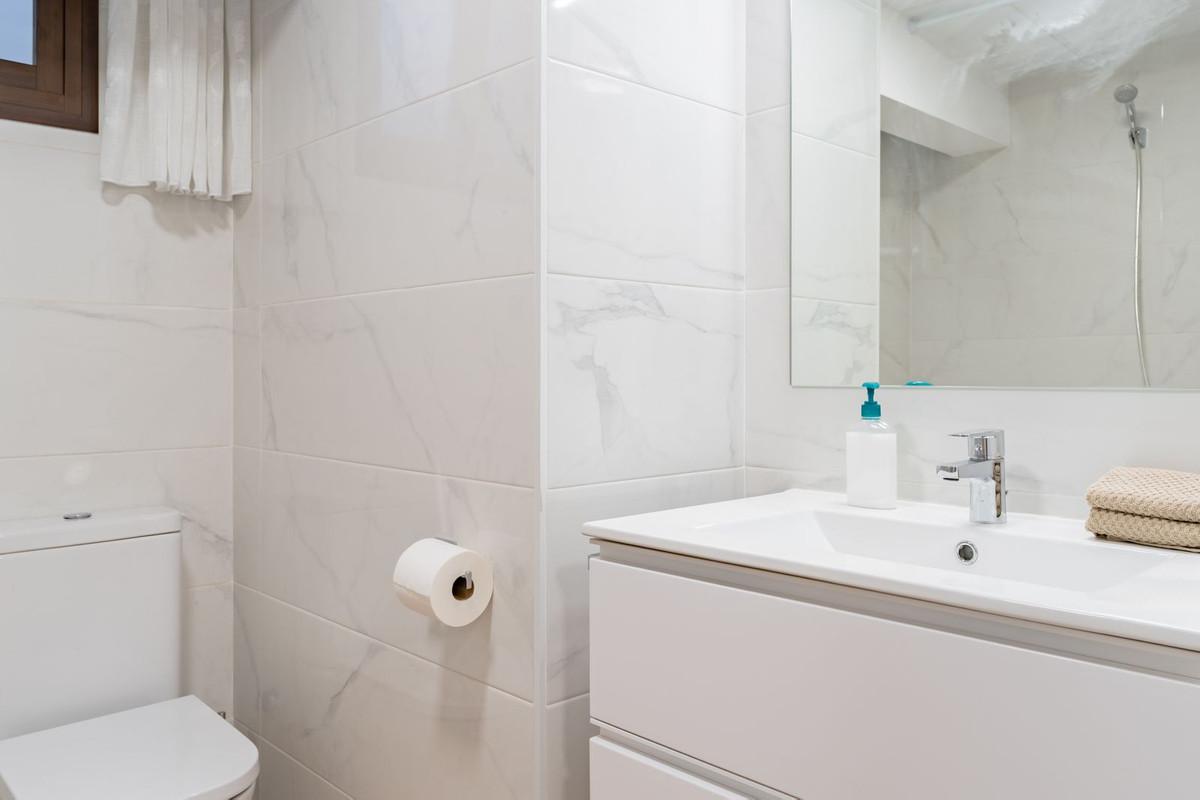 À l'intérieur, le rez-de-chaussée comprend un vaste séjour/salle à manger baigné de lumière naturelle, une cuisine entièrement équipée et trois chambres, dont deux avec salle de bains privative. Depuis le séjour, on accède à une superbe cour intérieure de style andalou, agrémentée d'une fontaine apaisante : un lieu idyllique pour se détendre.