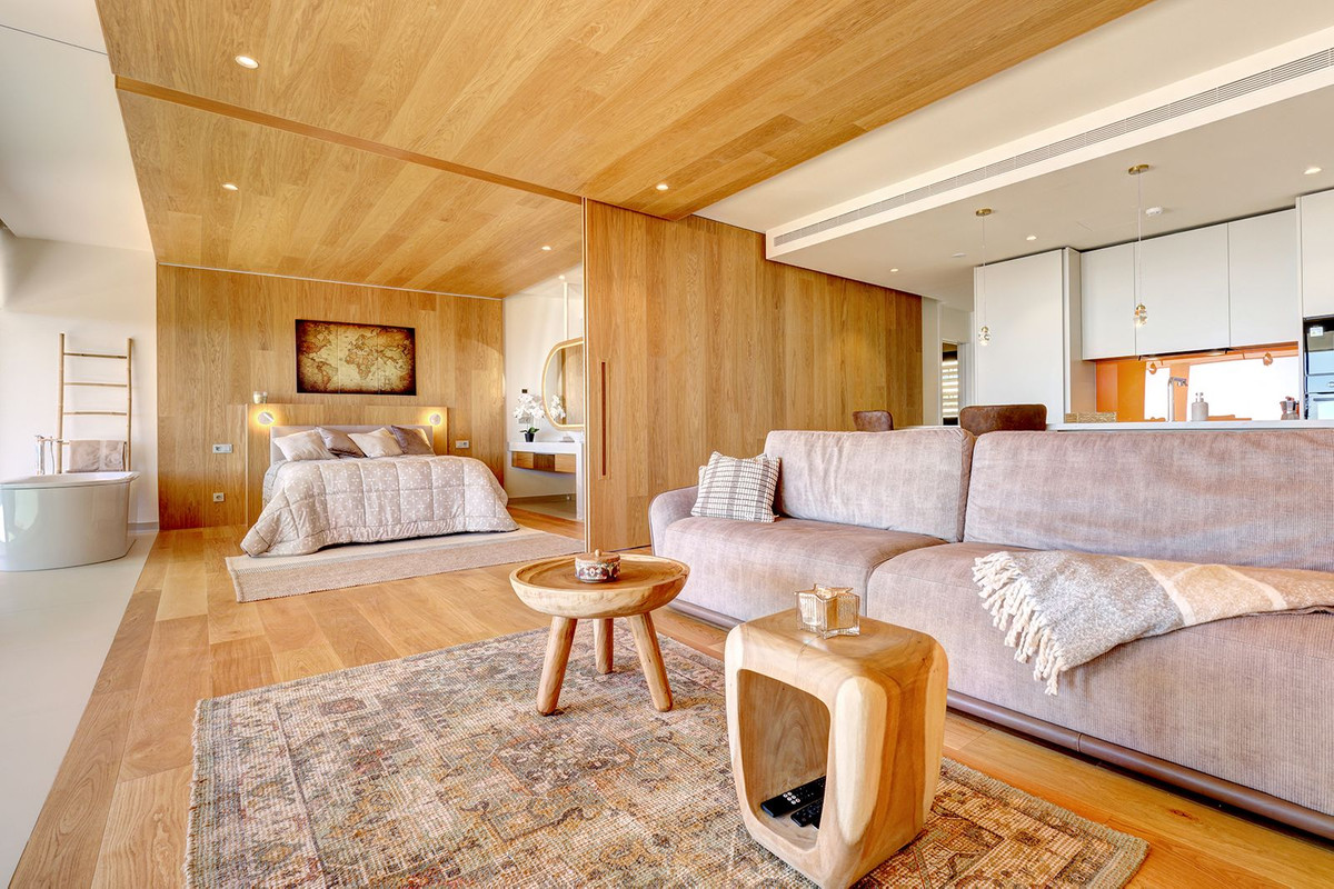 Benefiting from a direct south orientation, the home enjoys beautiful natural light throughout the day and lovely sea views from the living area and terrace. The interior combines modern design with warm, high-quality finishes. The layout is smart and open, with floor-to-ceiling windows that enhance brightness and space. The master bedroom features a sliding wall that opens onto the living room, adding a luxurious and flexible design element.