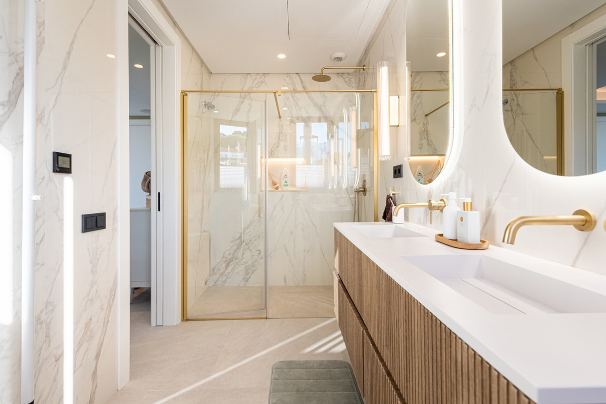 Le rez-de-chaussée comprend un salon spacieux et une cuisine américaine design avec des baies vitrées offrant une vue imprenable sur les montagnes. De là, les espaces de vie s'ouvrent naturellement sur un jardin paysager soigné et une piscine à débordement d'eau salée chauffée. Ce niveau abrite également une suite d'invités généreuse avec salle de bains privative, ainsi que des toilettes invités élégantes.