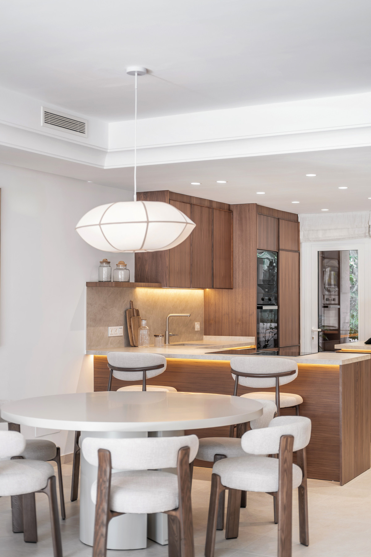Le rez-de-chaussée donne le ton avec un agencement ouvert et raffiné où la cuisine design se fond harmonieusement dans les espaces salle à manger et salon. De larges baies vitrées coulissantes s'ouvrent sur le jardin privatif exposé plein sud, créant une transition naturelle entre l'intérieur et l'extérieur – idéale pour un quotidien paisible comme pour recevoir. Des toilettes invités sont également situées à ce niveau.