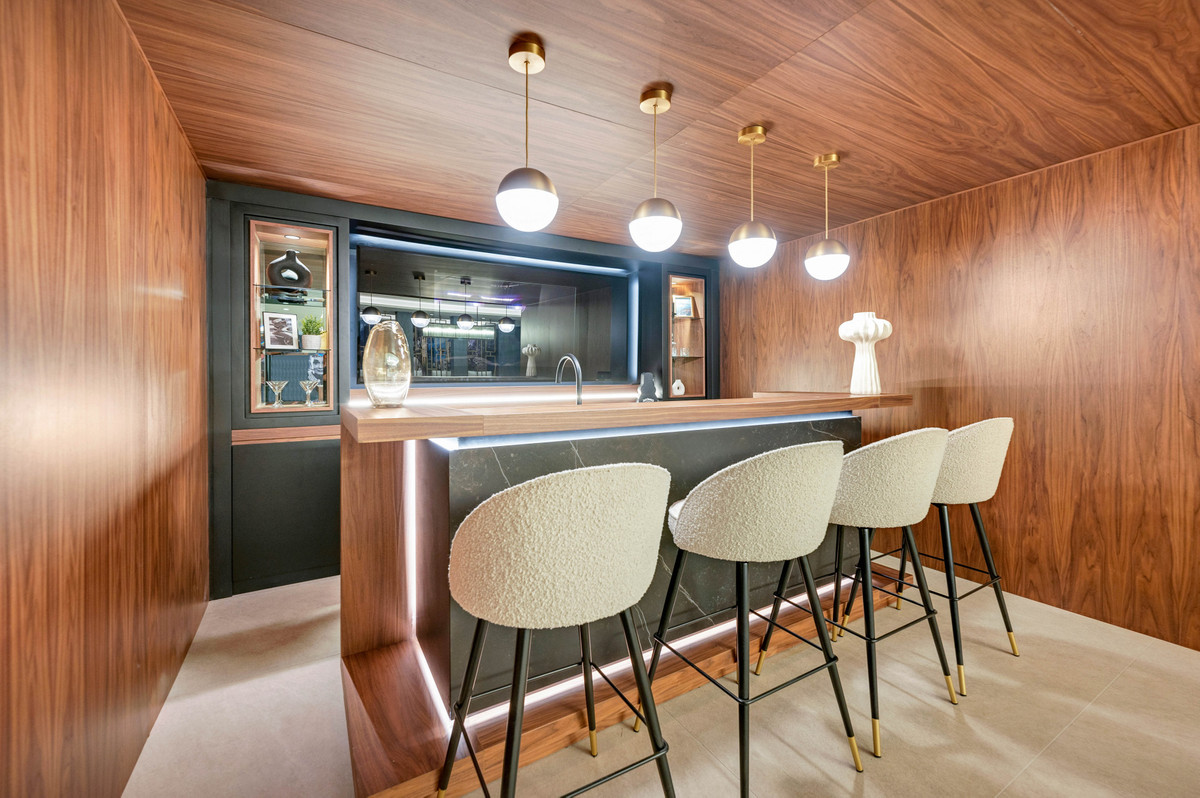Un espace de bien-être et de divertissement luxueux : salle de cinéma, cave à vin vitrée, salle de sport entièrement équipée, sauna, hammam et bassin d'eau froide. Une salle de jeux avec bar design, un second salon confortable et deux chambres avec salle de bains privative de plain-pied offrent un refuge idéal. Sont également inclus : une pièce sécurisée, des espaces de rangement, un local technique et un chauffage au sol intégral.