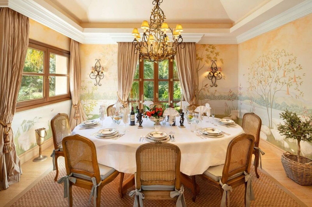 À l'extérieur, des jardins impeccablement entretenus entourent une grande piscine privée, idéale pour profiter du climat de la Costa del Sol. La propriété comprend également un garage, un cellier et toutes les commodités nécessaires à un confort haut de gamme.
