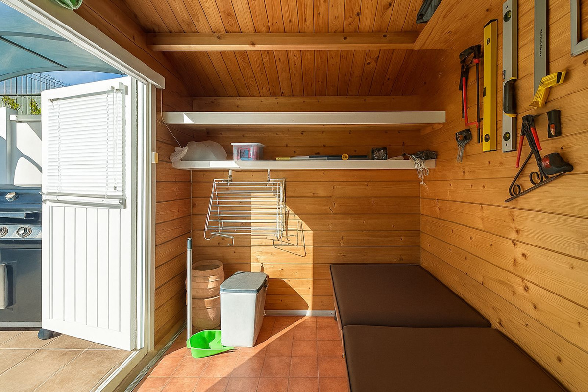 De plus, la terrasse supérieure comprend une petite cabane qui sert actuellement d'atelier et de débarras, mais qui dispose d'une minuscule kitchenette, offrant la possibilité d'être convertie en studio indépendant ou en chambre d'amis.