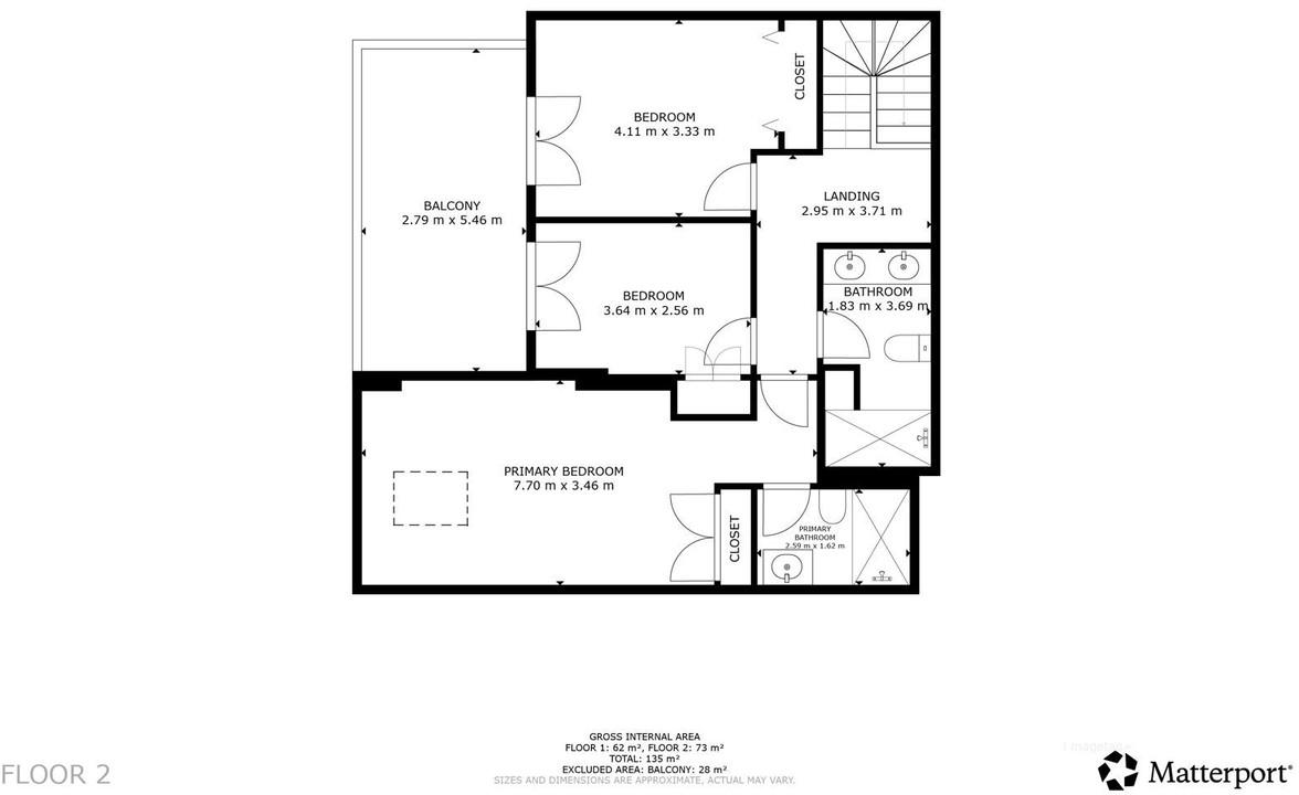 À l'étage : Trois chambres + 2 salles de bains, comme suit :