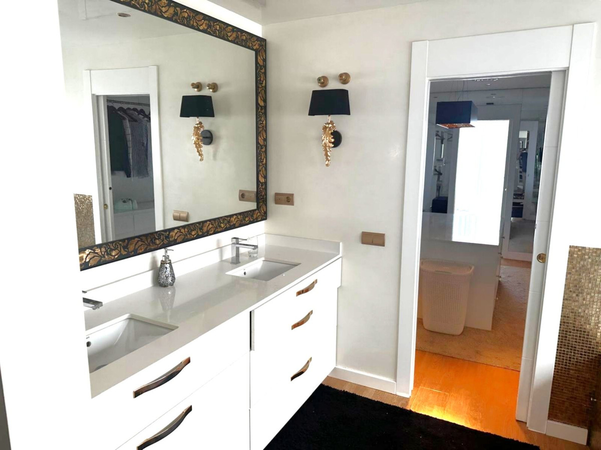 • À l'étage supérieur se trouvent deux chambres, une salle de bains, une terrasse couverte et découverte, et la piscine privée de 21 m².