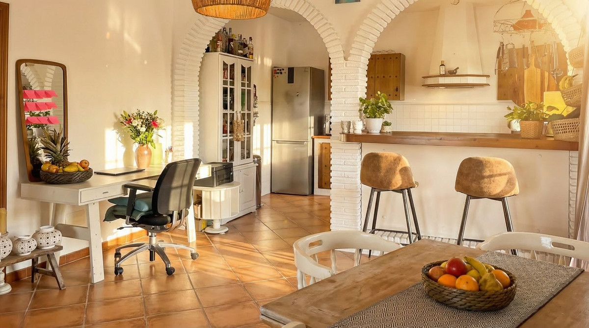 À l'intérieur, la villa dégage un charme andalou chaleureux, avec ses sols en terre cuite et ses élégantes arcades, combinés à un agencement ouvert donnant directement sur la terrasse et la piscine. L'espace de vie se compose d'une cuisine ouverte avec un bar et d'un salon spacieux et accueillant.