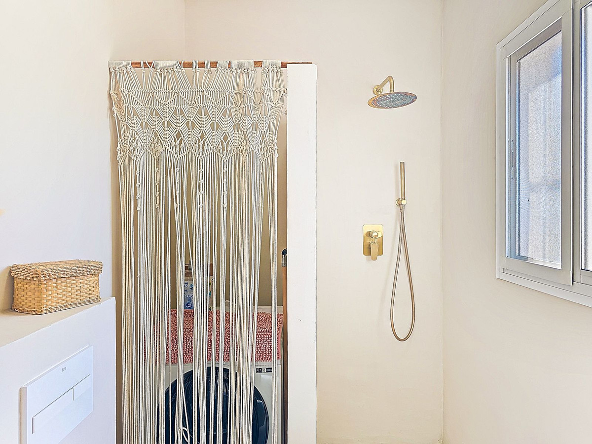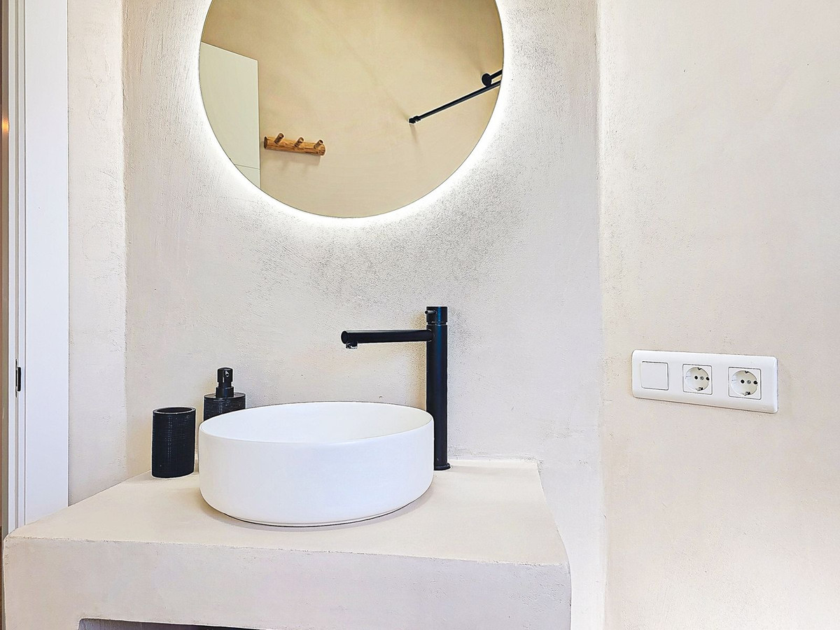 La villa offre une surface habitable de 94 m² et comprend trois chambres, chacune climatisée et dotée de placards intégrés de style ibicenco. Elle dispose de deux salles de bains avec douches à l'italienne, dont une attenante à la chambre principale. La cuisine entièrement équipée, également de style ibicenco, comprend un réfrigérateur, un congélateur, une plaque de cuisson vitrocéramique, un four électrique, un micro-ondes et un lave-vaisselle. Le salon lumineux est climatisé et agrémenté d'une cheminée. Il donne directement sur la vaste terrasse et la piscine.