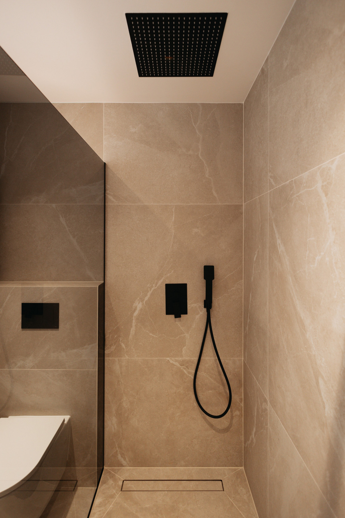 L'étage inférieur comprend deux chambres spacieuses avec lits doubles, placards intégrés et un grand débarras. L'élégante salle de bains est équipée d'une douche à effet pluie, d'un chauffage au sol et d'un lave-linge séchant pour plus de confort.
