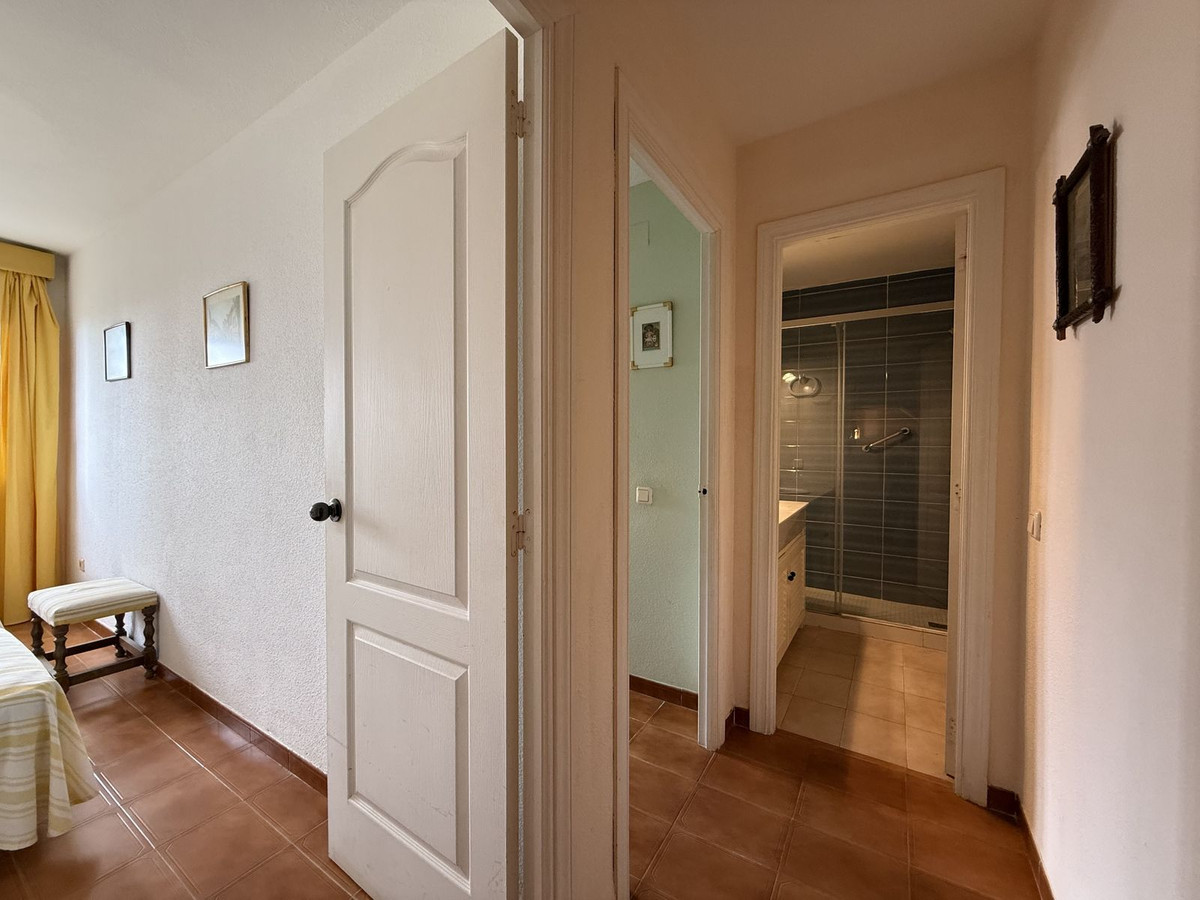 La chambre principale dispose d'une salle de bains attenante avec placards intégrés du sol au plafond, vue sur la mer, la Torre La Sal et la baie de Casares, ainsi que d'une salle de bains spacieuse avec fenêtre.