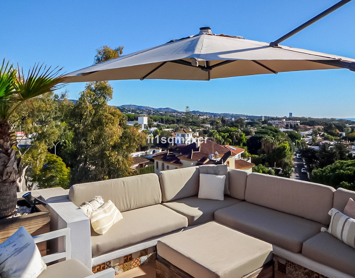 Ce penthouse d'angle unique, offrant une vue extraordinaire, se situe à quelques minutes à pied de l'une des plus belles plages de Marbella, réputée pour ses clubs de plage, chiringuitos et restaurants de plage haut de gamme. Entièrement repensé et modernisé avec des matériaux de la plus haute qualité, il bénéficie d'une vue spectaculaire sur l'ensemble du littoral, l'Afrique et les montagnes. Au quatrième étage : un hall d'entrée avec escalier menant à l'étage, des toilettes invités, une cuisine moderne neuve avec bar et électroménager haut de gamme, un coin TV avec poêle à bois pour des soirées romantiques, une grande salle à manger en L avec vue panoramique, une chambre et une salle de bains spacieuse.