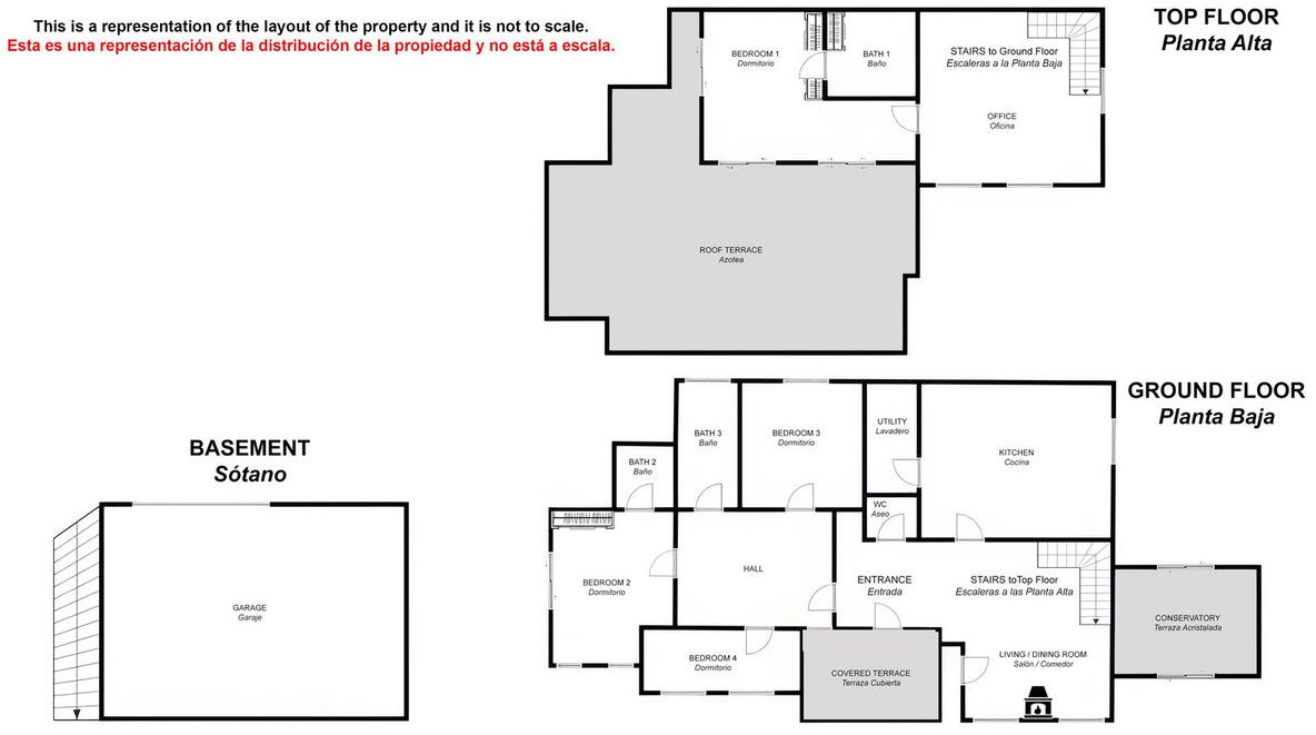 Le rez-de-chaussée de la villa est aménagé dans un style rustique et comprend un salon spacieux avec cheminée, une cuisine entièrement équipée avec buanderie, 3 chambres doubles (toutes avec placards intégrés), 2 salles de bains et des toilettes pour invités.