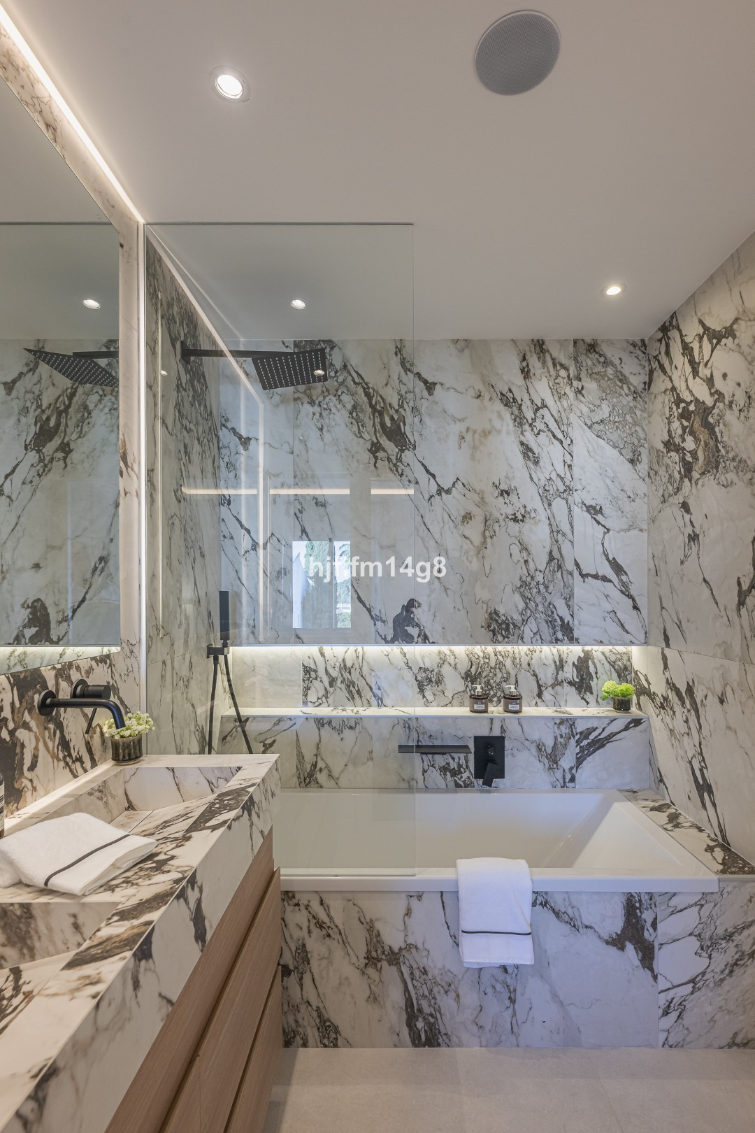 L'étage supérieur abrite une élégante suite parentale avec salle de bains privative et une chambre d'amis également dotée d'une salle de bains privative. Ces espaces comprennent des dressings sur mesure et des meubles de salle de bains personnalisés, avec des finitions raffinées, notamment des tables de chevet en travertin dans la chambre faisant face à la suite parentale. Toutes les salles de bains sont revêtues de carreaux grand format, tandis que les toilettes pour invités arborent de magnifiques carreaux de porcelaine texturée haut de gamme.