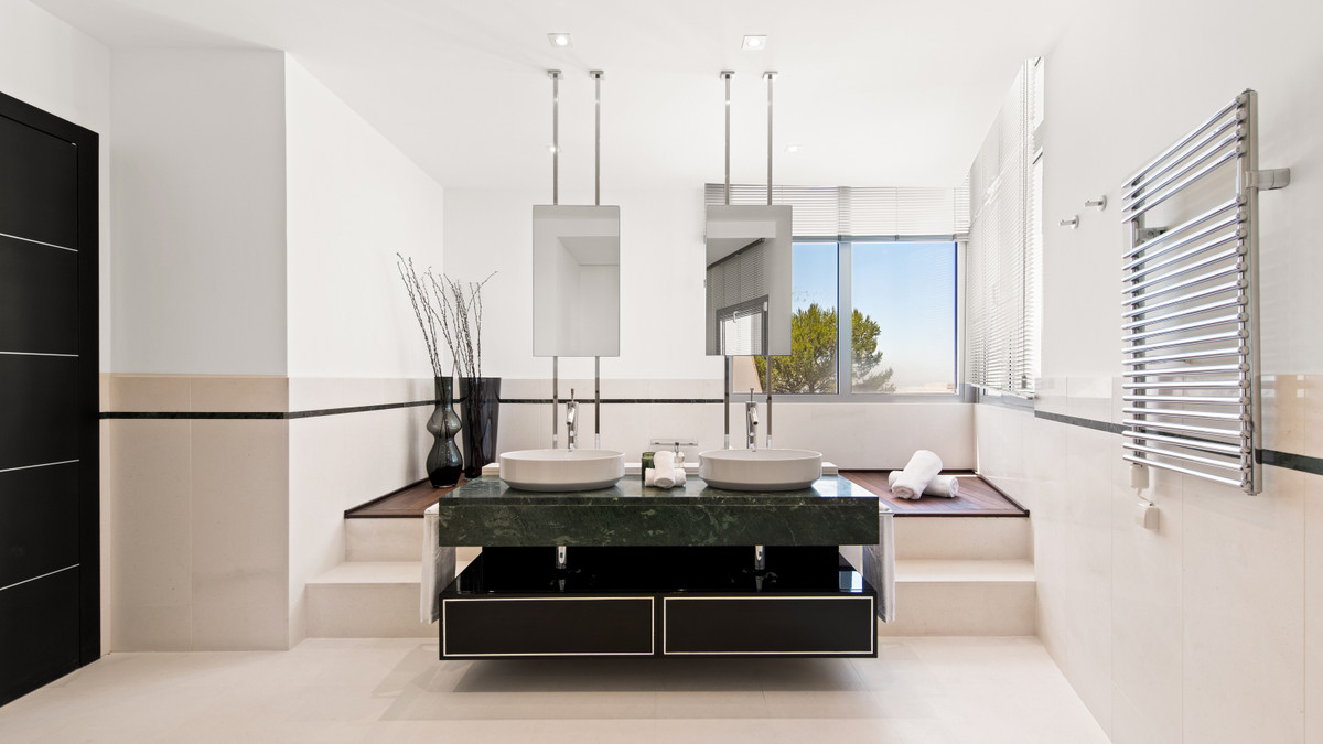 La propriété est répartie sur 4 niveaux reliés par un ascenseur et un escalier ultramoderne. Elle comprend 4 chambres et 4 salles de bains privatives, toutes équipées d'une baignoire hydromassage et d'une douche séparée, ainsi qu'un WC invités, un vaste séjour et une cuisine entièrement équipée en noir et blanc avec îlot central/coin repas et accès à une terrasse pour les repas en plein air.