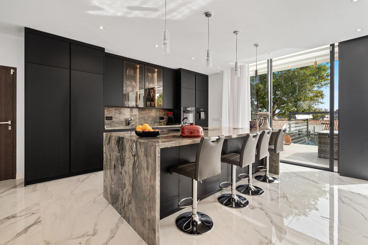 Le niveau principal, ouvert et lumineux, comprend un vaste salon, une salle à manger et une cuisine design entièrement équipée d'appareils haut de gamme Gaggenau et Miele. Ce niveau abrite également deux chambres avec salle de bains privative et accès direct à l'extérieur. De grandes baies vitrées inondent les pièces de lumière naturelle et créent une transition harmonieuse entre l'intérieur et l'extérieur.