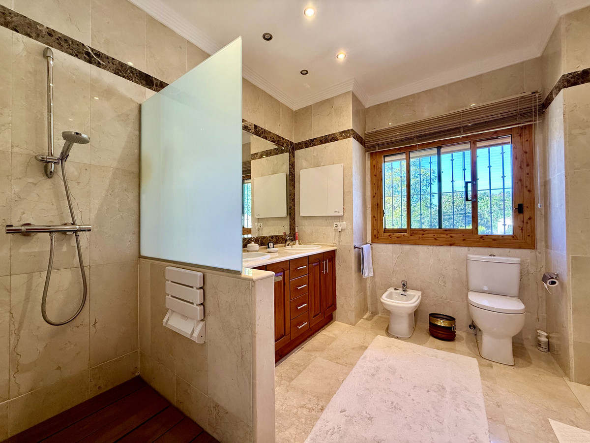 This great property has just come to the market at a very competitive price. It's an Ideal location, walking distance to several commercial centers make it very desirable for those who don't want to take the car to enjoy facilities and restaurants, supermarket, pharmacy, gym or a nice coffee shop. The property is in a lovely condition. The villa has a nice elegant andalusian style. The entrance hall connect to the right with the separate dining room, the fully fitted kitchen ad the large covered and uncovered terrace to the landscaped mature and very private garden and pool. The spacious living room has a high ceiling with wooden beams. On the same level we find two bedrooms with en suite bathroom. A nice stair case bring us up tot he first floor where we find a large and very bright bedroom and the master bedroom with , ensuite bathroom and access to a large very sunny uncovered terrace with lovely mountain views. Going down to the basement we find a games room, a hobby room with bathroom and the very large garage for several cars. Also the utility room. This great family property enjoys a fantastic mature garden and a lovely entrance area. International schools like Atalaya, San José in Guadalmina are just nearby. Proximity to all facilities as several golf courses like El Paraiso, Atalaya or los Flamingos, the beach at 15 minutes walk, The lovely El Campanario sport club with fantastic indoor pool, gym, spa and much more make this a unique family home. A visit is highly recommended.