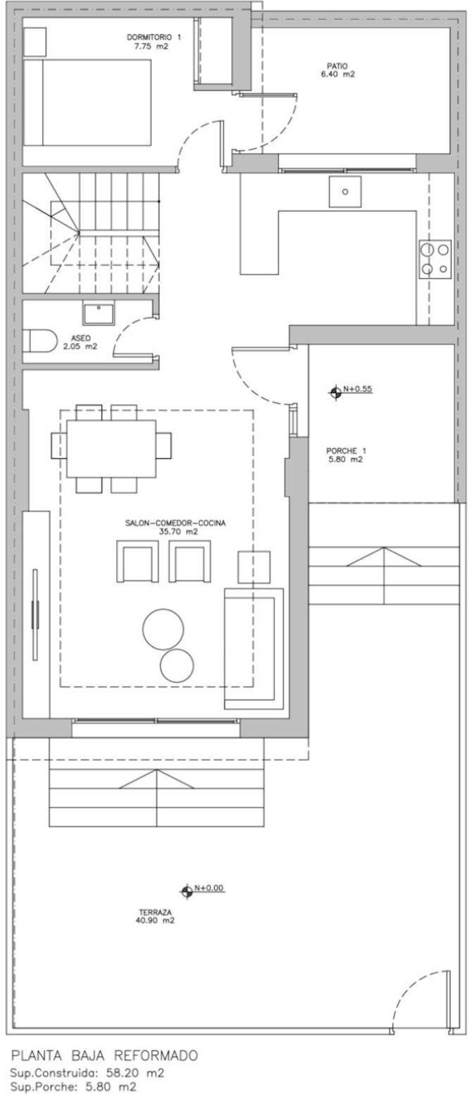 Ground floor: 1 bedroom, 1 bathroom, living room, and kitchen.