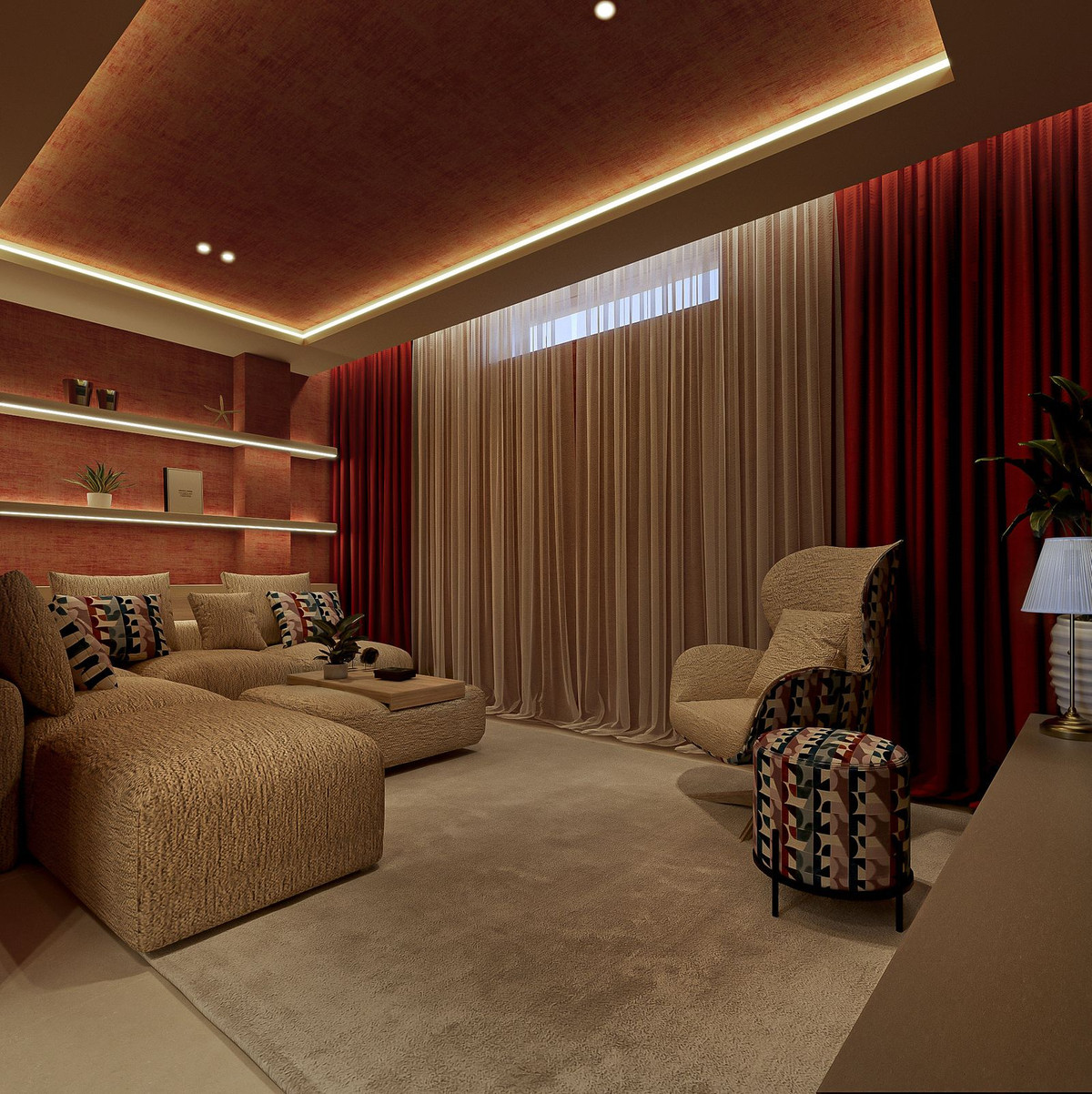 L'une des chambres est actuellement aménagée en salle de cinéma et de jeux intimiste, équipée d'un grand écran de télévision, d'un système audio et d'un éclairage LED d'ambiance. Elle peut facilement être transformée en une cinquième chambre avec salle de bains privative. L'éclairage a été soigneusement pensé : la plupart des plafonniers et des luminaires d'ambiance sont équipés de variateurs afin de créer des atmosphères modulables dans toute la maison.