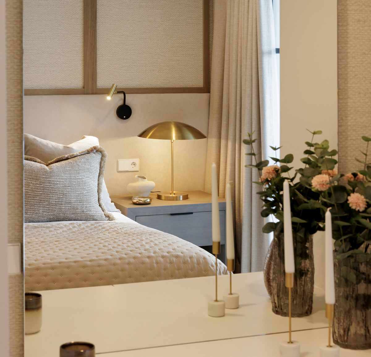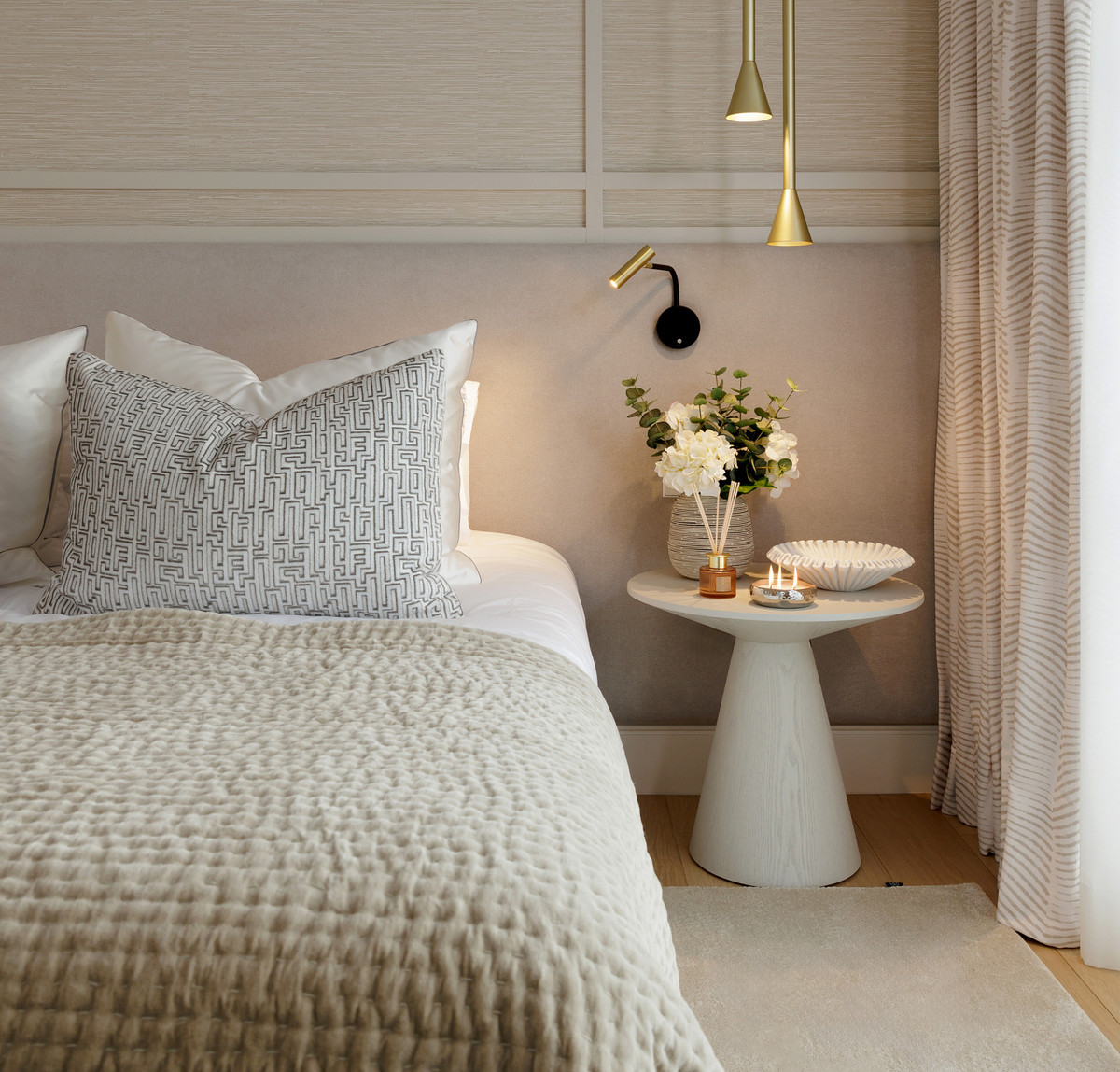 La propriété comprend cinq chambres élégantes, dont une suite parentale privative à l'étage avec accès direct à une terrasse. Chaque chambre arbore le même style : tons neutres, menuiseries sur mesure et éclairage soigné. L'étage supérieur s'ouvre également sur de vastes espaces extérieurs offrant une vue imprenable sur le littoral.