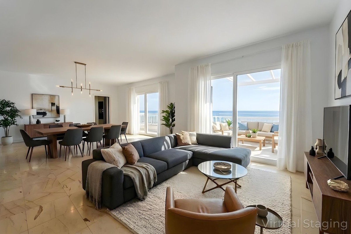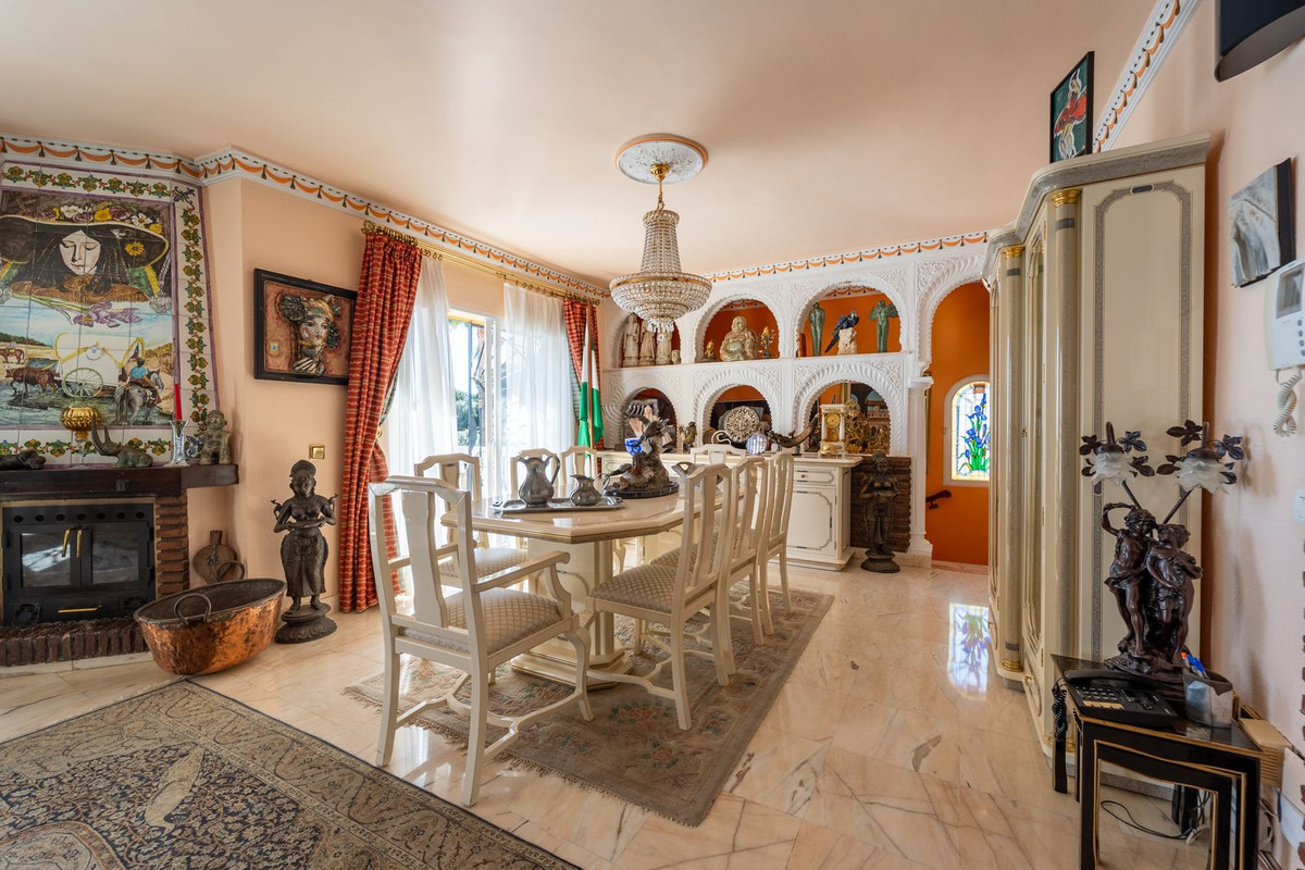 Le hall d'entrée, inspiré du style andalou classique, s'ouvre sur le salon principal, un espace lumineux et accueillant donnant directement sur une vaste terrasse. On peut s'y imaginer savourer des petits déjeuners en famille tout en admirant la vue imprenable sur la mer. Avec son sol en marbre, sa cheminée et sa climatisation, ce salon devient le cœur de la maison et le cadre idéal pour des moments inoubliables.