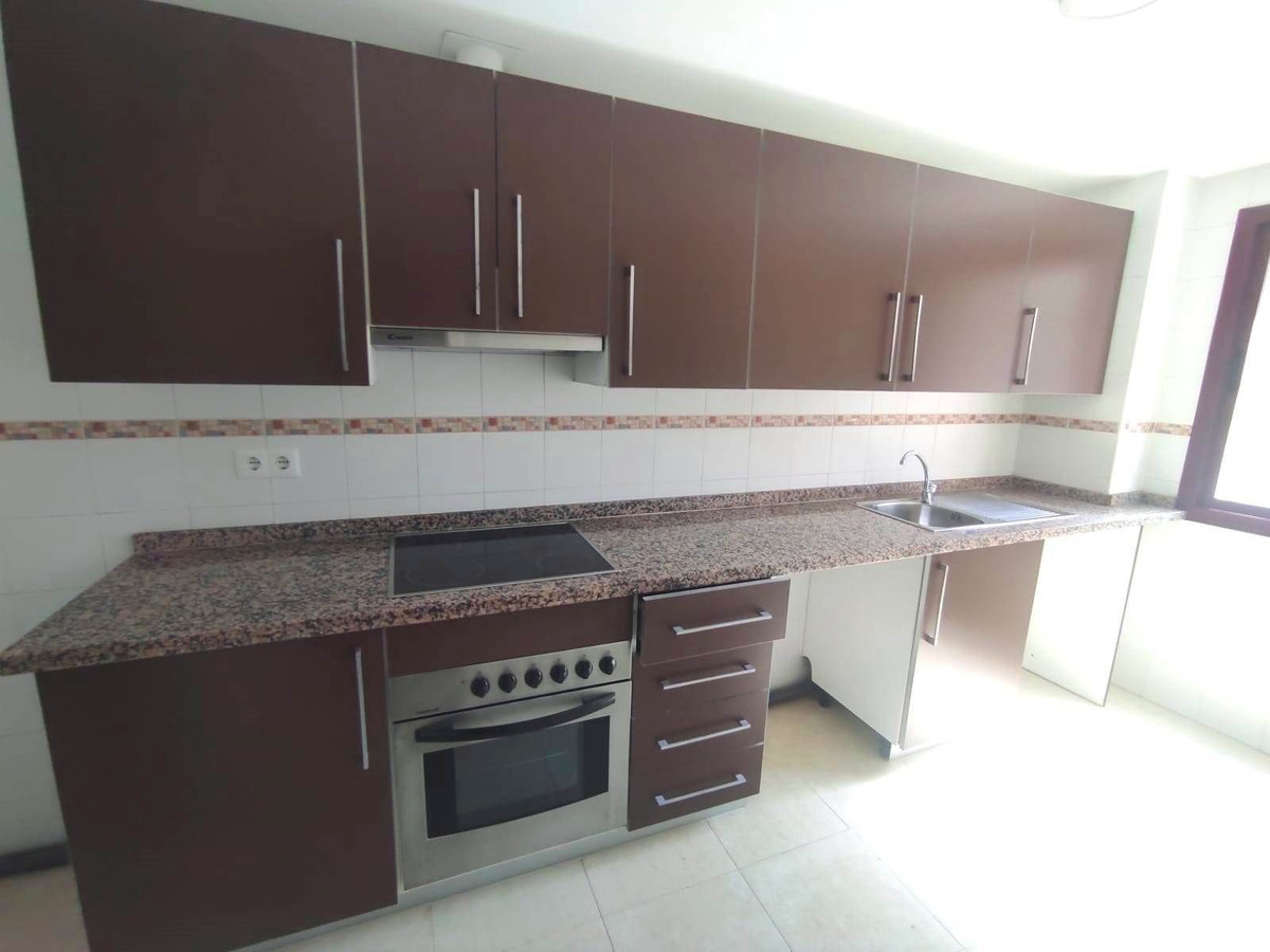 La cuisine est équipée de placards hauts et bas et comprend une plaque de cuisson vitrocéramique, un four et une hotte aspirante. L'appartement dispose également de placards intégrés, d'une place de parking et d'un accès à de vastes espaces communs avec piscine et jardins.