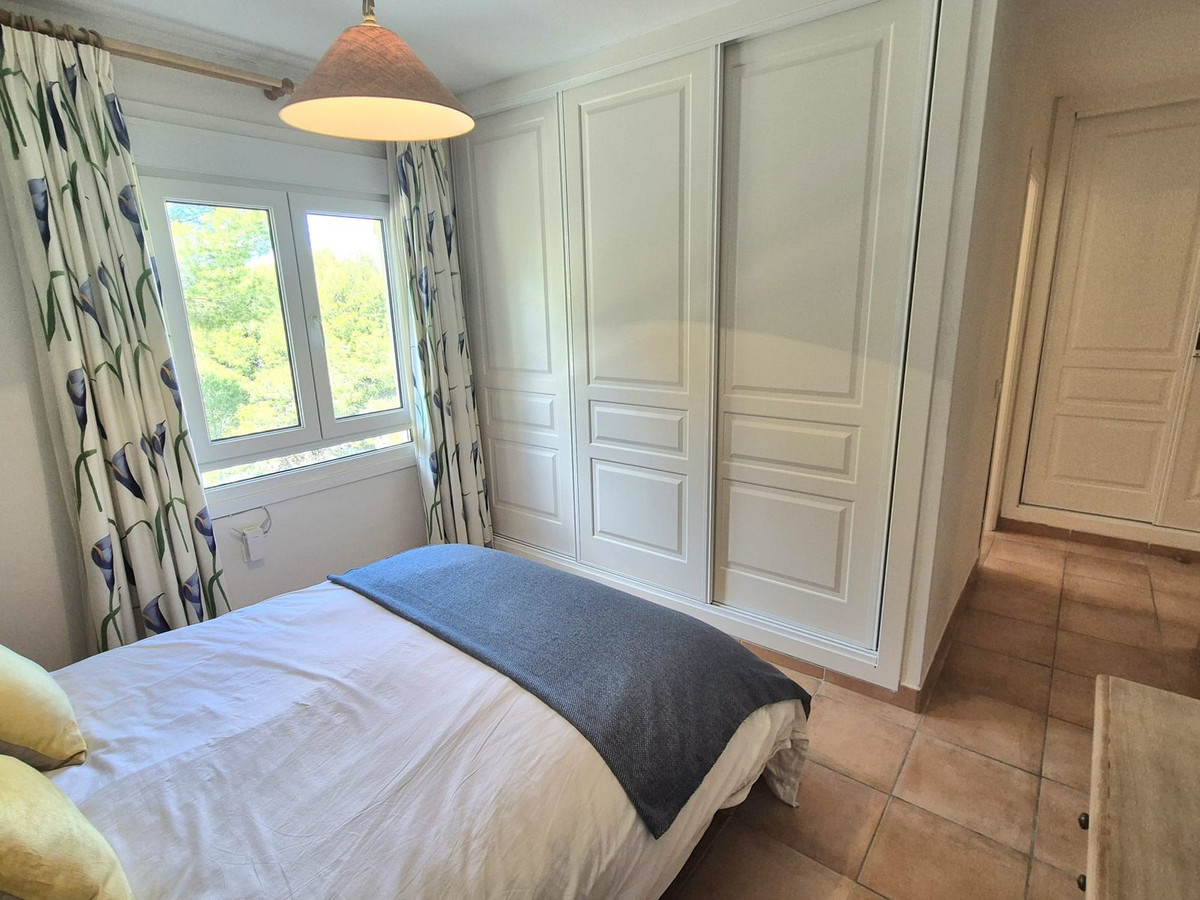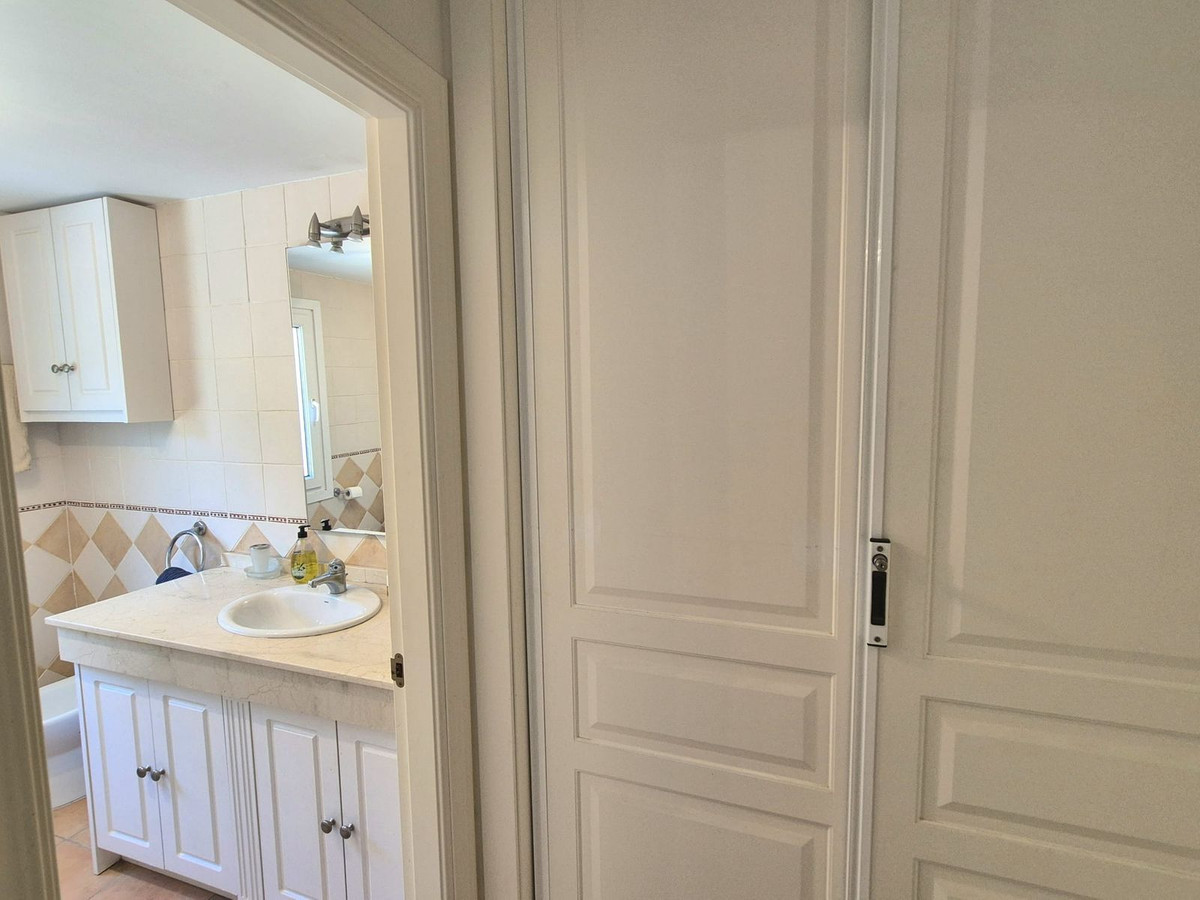 Vous disposez d'une place de parking privative et de nombreuses places de stationnement dans la rue. La résidence bénéficie d'une belle piscine commune à proximité. En entrant, vous accédez à un hall d'entrée. Sur votre gauche, vous trouverez une cuisine entièrement équipée donnant sur une terrasse andalouse carrelée, aménagée en coin salon supplémentaire et communiquant avec la salle à manger. De retour dans le hall, vous trouverez des toilettes, l'escalier menant au premier étage et le couloir menant au séjour/salle à manger. Cet espace est agencé sur deux niveaux. Quelques marches vous mènent au séjour, climatisé (chaud/froid), doté d'une cheminée fonctionnelle et de portes-fenêtres donnant sur le jardin privatif exposé sud-ouest. Ce jardin est agrémenté d'une vigne mature offrant ombre et raisins mûrs. Vous profiterez également d'une belle vue sur les montagnes et sur le château d'eau, visible depuis le séjour et le premier étage. Un placard de rangement est aménagé sous l'escalier.