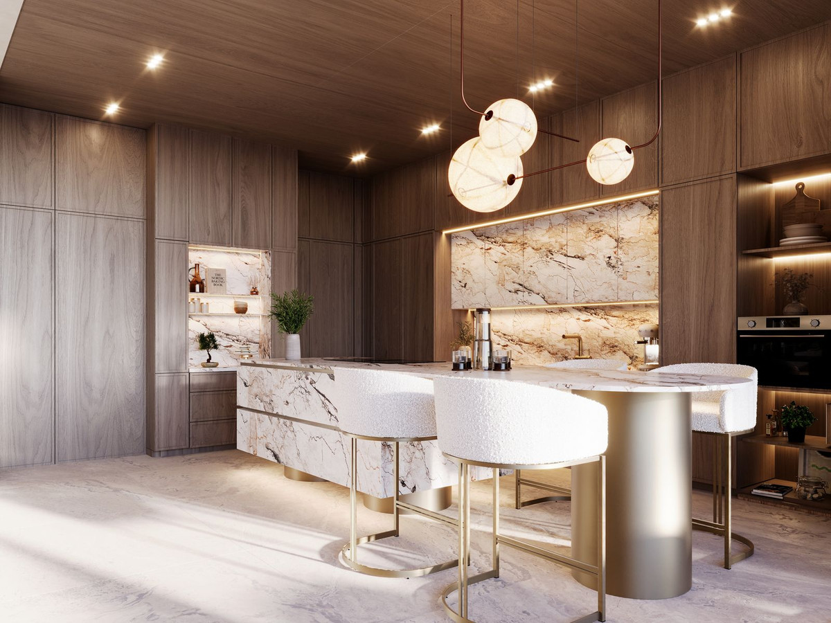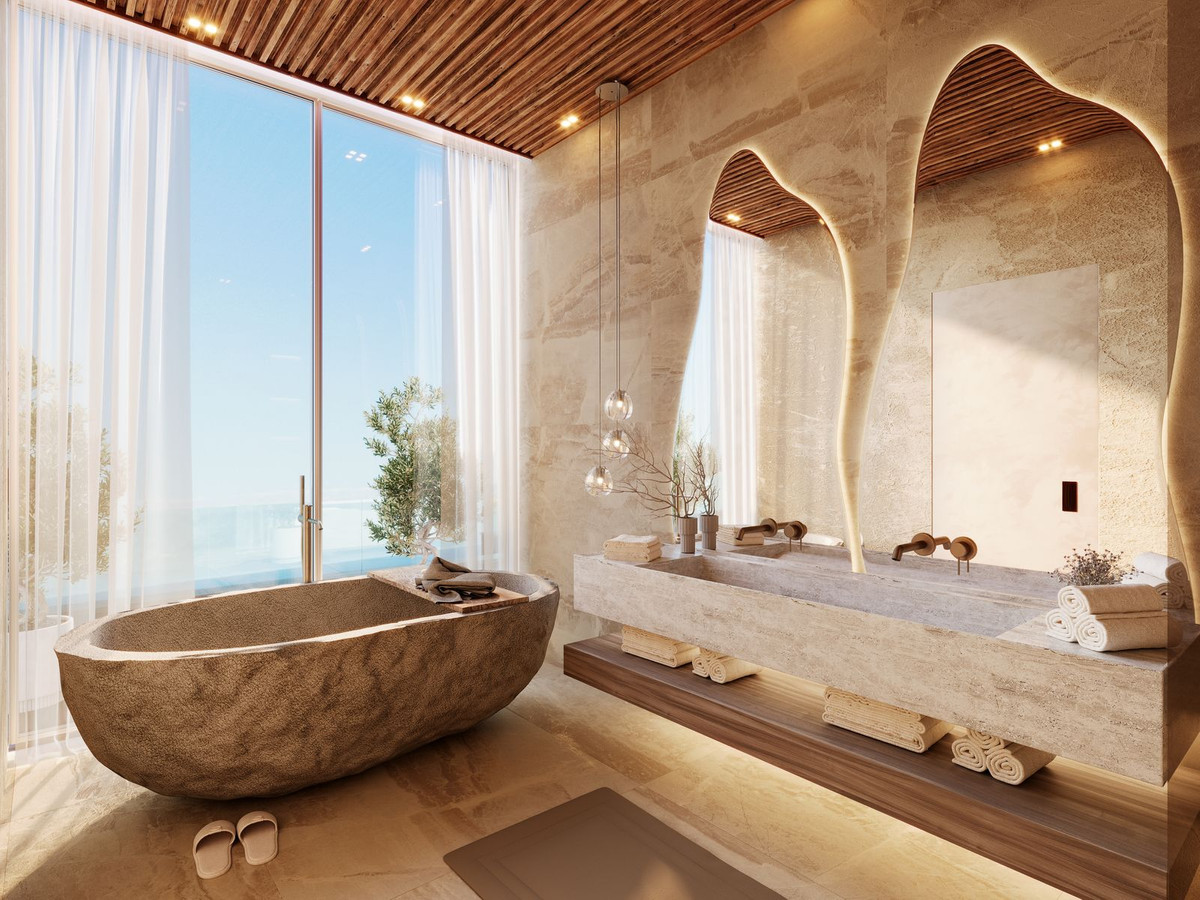 Espace nuit comprenant plusieurs chambres avec salle de bains privative, dressings privés, salles de bains luxueuses et terrasses offrant une vue panoramique.