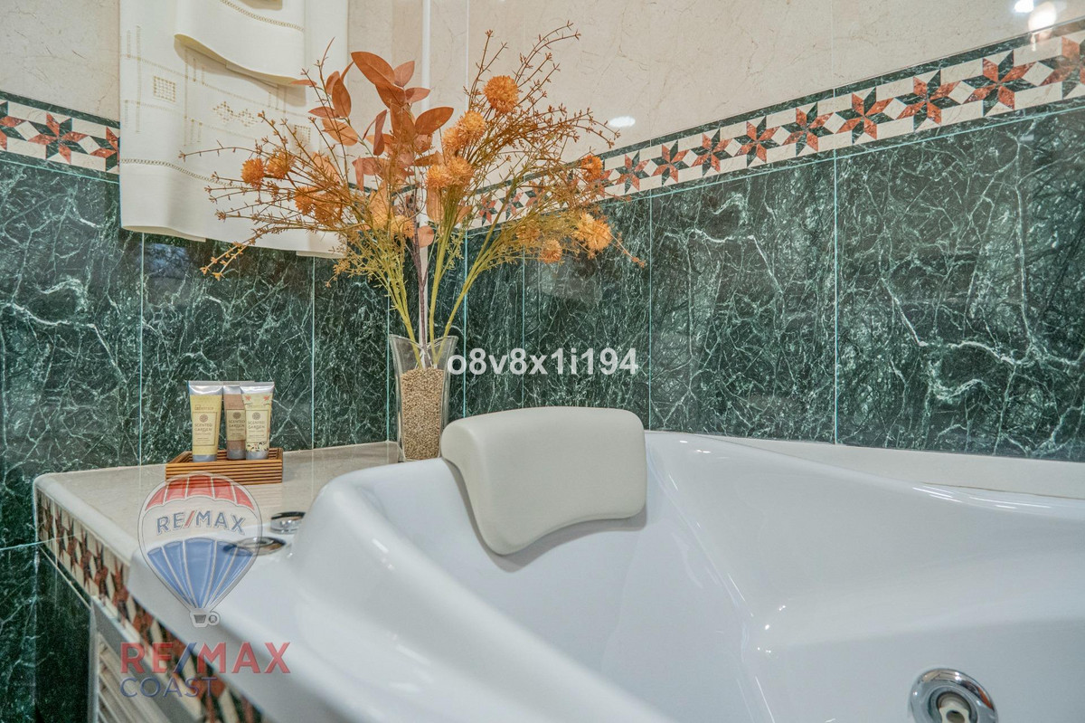 The kitchen opens onto an exquisitely decorated patio—your very own oasis—featuring a wood-fired oven, bar area, and a fountain that adds the soothing sound of water. It's ideal for outdoor dining or simply enjoying the ambiance.