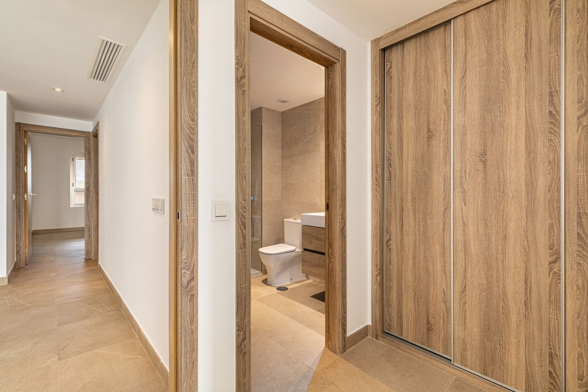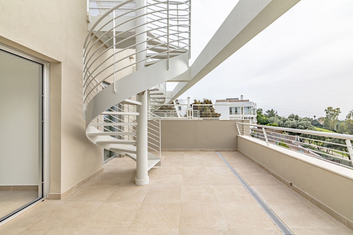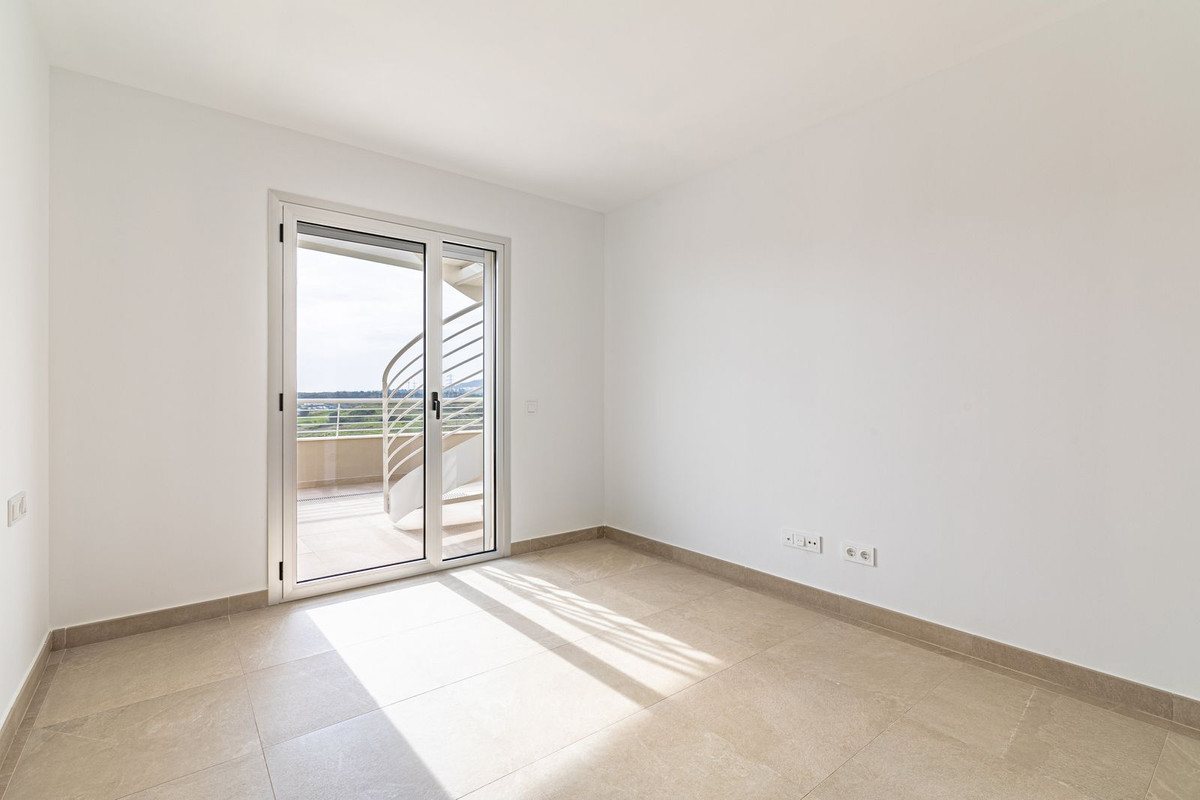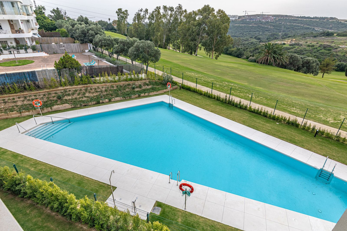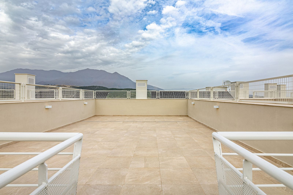 Penthouse located in Estepona Golf within the newly built Sunny Golf complex. The community features a swimming pool and outdoor parking, with one parking space included. It offers 2 bedrooms and 2 bathrooms, one of which is en-suite. There's a terrace on the main level and a rooftop terrace upstairs, enjoying sun all day.The bedrooms are generously sized with built-in wardrobes and electric blinds. Both bathrooms are fully fitted with showers and feature attractive material choices in warm, natural colors. The open-plan kitchen flows into the living room, creating an open feel and excellent social areas, with the possibility of adding more workspace or a breakfast bar.
