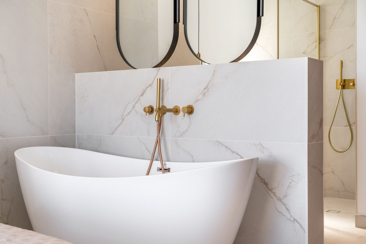 La suite parentale est conçue comme un véritable sanctuaire, où une imposante baignoire îlot a été judicieusement positionnée pour offrir une vue imprenable sur la mer et le paysage. Chaque salle de bains est agrémentée d'un luxueux carrelage italien, soulignant l'esthétique raffinée de la propriété.