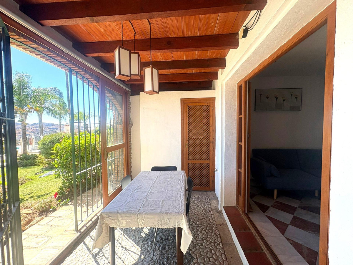 La propriété comprend une chambre spacieuse avec placards intégrés, une salle de bain complète ornée de carrelage andalou traditionnel et un agencement pensé pour optimiser chaque mètre carré. Le salon lumineux et accueillant, doté d'une cheminée, apporte chaleur et caractère, idéal pour des soirées conviviales. La cuisine ouverte, entièrement équipée, s'intègre harmonieusement à l'espace de vie, créant une atmosphère fonctionnelle et moderne tout en conservant une touche classique.