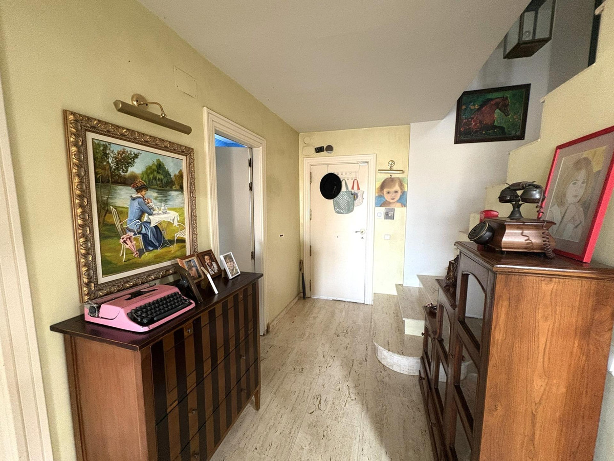 La propriété est répartie sur deux étages. L'étage supérieur comprend trois chambres lumineuses et spacieuses, idéales pour le repos et le confort. Au rez-de-chaussée, vous trouverez un grand hall d'entrée élégant, sublimé par un sol en travertin romain qui lui confère une touche classique et raffinée.