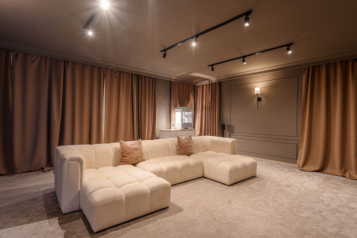 Upon entry, the villa welcomes you with a bright, open-plan layout. The ground floor comprises a high-end kitchen with real stone countertops, a stylish dining area, and a relaxing living space that connects seamlessly with the outdoor terraces and pool area. One guest bedroom and a functional home office are also found on this level. The upper floor is dedicated to the master suite and two additional bedrooms, all with large windows offering serene garden and pool views. The basement includes a stylish home cinema and another guest suite, ideal for entertaining or accommodating visitors.
