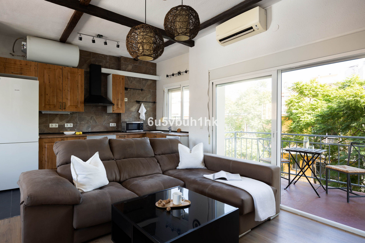 This charming apartment is situated on the third floor and offers a beautiful Andalusian touch with exposed wooden beams and high ceilings. The open-plan kitchen and living area create a bright and airy atmosphere with direct access to the sunny south-facing terrace — perfect for outdoor furniture, dining, and relaxation. The property features two spacious bedrooms with built-in wardrobes, one of which has a French balcony. A stylish bathroom completes the home.This property also includes an impressive rooftop terrace with stunning views over Fuengirola and the surrounding mountainsHere you live close to restaurants, shops, the train station, and the beach — everything you need to enjoy the best of life on the Costa del Sol!For more information or to arrange a viewing, please contact us.